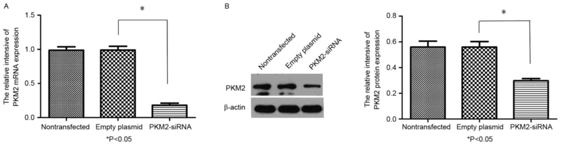 A pU6 plasmid, synthesized by Shanghai GeneChem Co., Ltd., (Shanghai, China), containing siRNA targeting PKM2 mRNA and empty plasmids as the negative control were transfected into the SGC-7901 cells using Lipofectamine® 2000 (Invitrogen; Thermo Fisher Scientific, Inc.), according to the manufacturer's protocol. Cells were cultured and selected in medium containing 400 mg/ml G418 (Santa Cruz Biotechnology, Inc., Dallas, TX, USA).