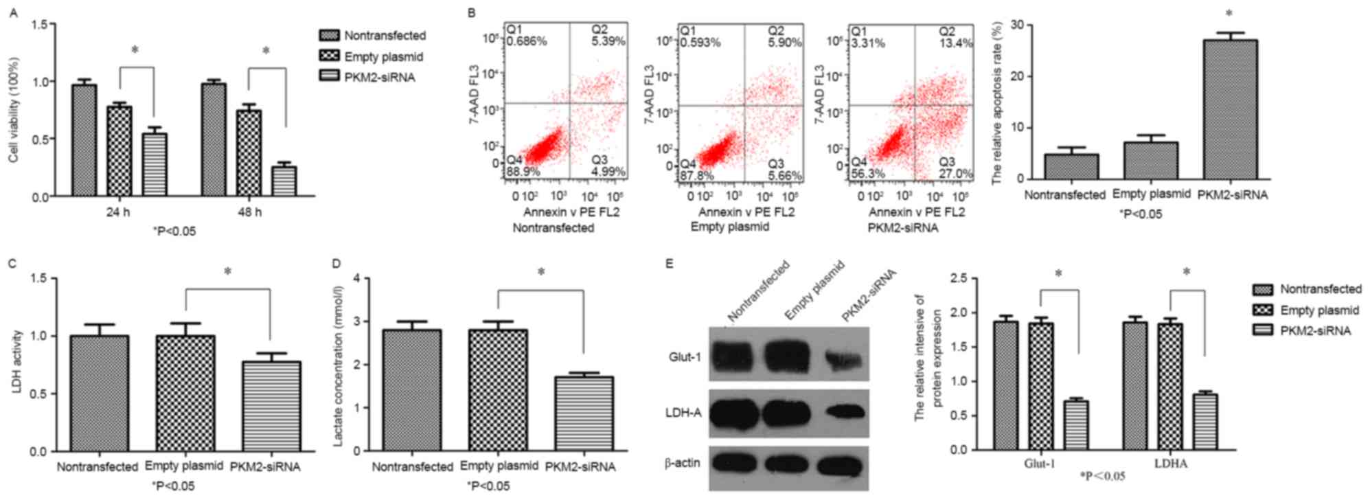 PKM2 vectors downregulating the plasmid or control plasmid (non-transfected group and empty plasmid group) were transfected into the SGC-7901 cells according to the protocol aforementioned. The expression levels of PKM2 were analyzed by RT-qPCR and immunoblotting. PKM2-siRNA decreased the mRNA (Fig. 3A) and protein (Fig. 3B) levels of PKM2 (P<0.05). A CCK-8 assay demonstrated significant time-dependent inhibition of SGC-7901 cell proliferation following the knockdown of PKM2 (Fig. 4A; P<0.05). It was further revealed that the early apoptosis rate of SGC-7901/PKM2-siRNA cells was increased compared with that of the control cells (Fig. 4B; P<0.05). These results indicated that PKM2 was able to promote the proliferation and suppress the apoptosis of GC cells. To determine whether PKM2 knockdown exerts any influence on the Warburg effect in SGC7901 cells, LDH activity and lactate production were measured. Compared with the control groups, LDH activity (Fig. 4C) and lactate production (Fig. 4D) in SGC7901 cells of the siRNA-PKM2 group was significantly decreased (P<0.05). Western blotting demonstrated that the knockdown of PKM2 significantly decreased Glut-1 and LDHA protein expression levels (Fig. 4E), compared with in the non-transfected or empty plasmid groups. In combination, these outcomes indicate that PKM2-knockdown in SGC-7901 cells was associated with the Warburg effect.