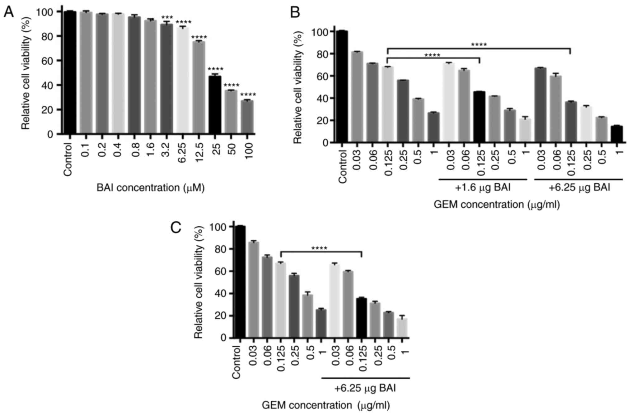 CFPAC-1 or PANC-1 cells were cultured in 96-well plates at 1×105 cells per well. After 24 h, the cells were treated with multiple concentration of BAI alone (0.1, 0.2, 0.4, 0.8, 1.6, 3.2, 6.25, 12.5, 25, 50 and 100 µM), GEM alone (0.03, 0.06, 0.125, 0.25, 0.5 and 1 µg/ml) or combination treatment (0.03, 0.06, 0.125, 0.25, 0.5 and 1 µg/ml GEM with either 1.6 or 6.25 µg BAI) for 48 h, the control group was treated with PBS (pH 7.4). Subsequently, 50 µl MTT (1 µg/ml; Sigma-Aldrich; Merck KGaA, Darmstadt, Germany) was added to the cell media and incubated for 4 h at 37°C. MTT was discarded and 150 µl DMSO was loaded in each well. The spectrophotometric absorbance of the samples was measured using a microplate reader (Bio-Rad Model 680; Bio-Rad Laboratories, Inc., Hercules, CA, USA) at 570 nm with a reference wavelength of 655 nm. The percentage of cell survival was calculated using the following formula: Cell survival=absorbance value of infected cells/absorbance value of uninfected control cells. Six reduplicate wells were measured at each concentration and every experiment was performed at ≥3 times.