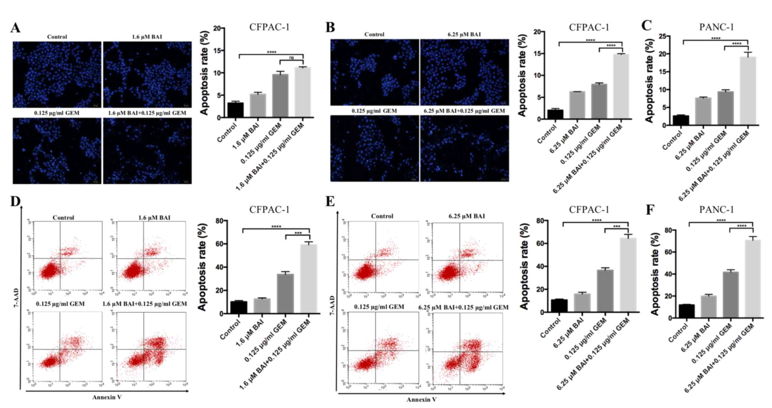 CFPAC-1 or PANC-1 cells treated with 0.125 µg/ml GEM or 1.6/6.25 µM BAI alone or a combination treatment were incubated for 48 h at 37°C, the control group was treated with vehicle solution, and then cells were collected and washed twice with cold PBS and subsequently incubated with Annexin V-FITC/7-ADD double staining solution at room temperature for 15 min. Then, the stained cells were analyzed using flow cytometry (BD Biosciences, San Jose, CA, USA). The cell apoptotic rates were analyzed using ModFIT software (version 3.2; Verity Software House, Inc., Topsham, ME, USA). Apoptotic events were recorded as a combination of Annexin V+/7-AAD− (early apoptotic) and Annexin V+/7-AAD+ (late apoptotic/dead) events. This experiment was conducted 3 times.