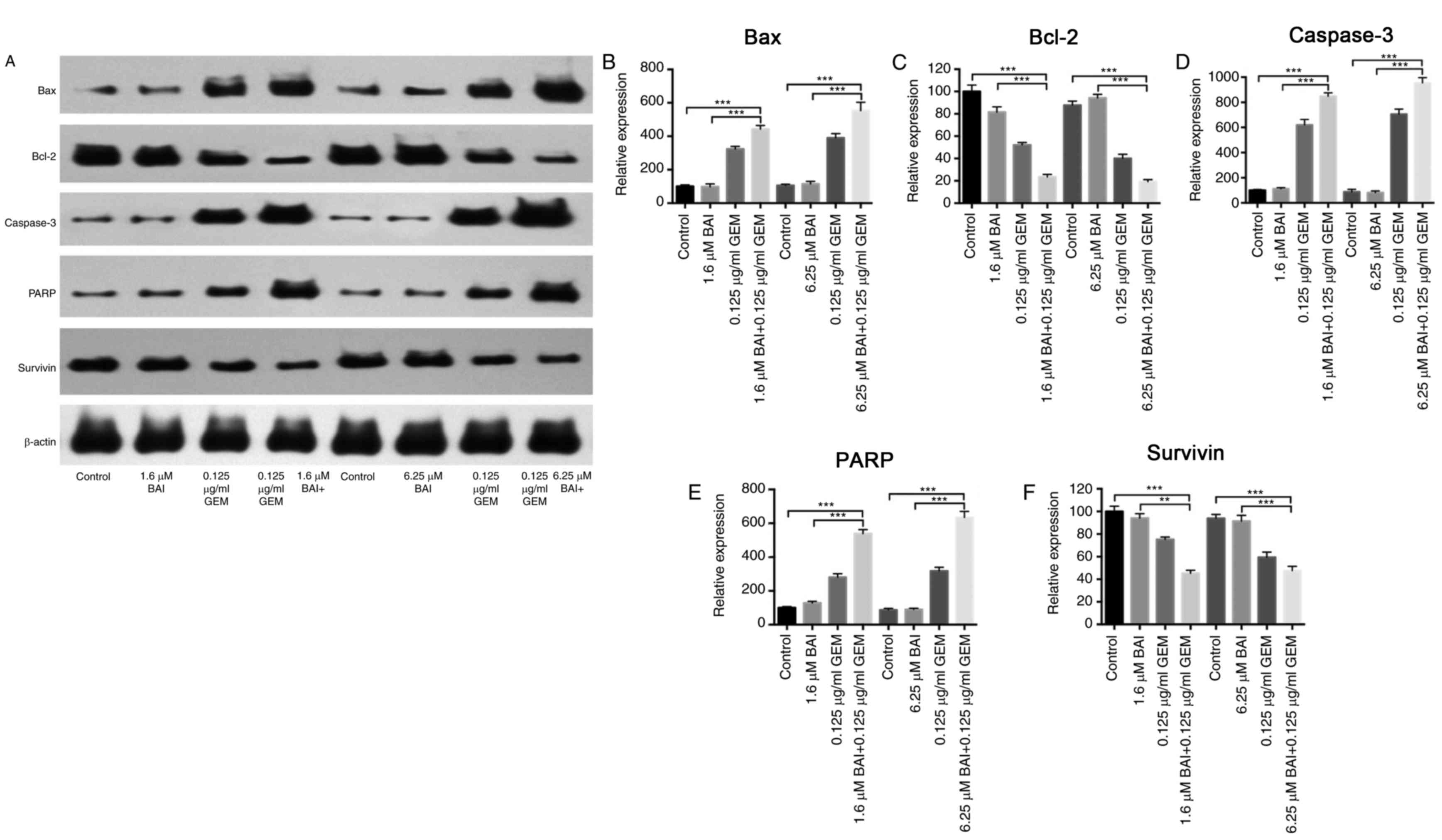 To conclude, in the present study, BAI was revealed to inhibit the proliferation of pancreatic cancer cells due to the induction of apoptosis in vitro and in vivo. Furthermore, evidence was provided that the efficacy of BAI was significantly improved when administered in combination with GEM. Therefore, the present study may provide an alternative strategy for the treatment of pancreatic cancer.