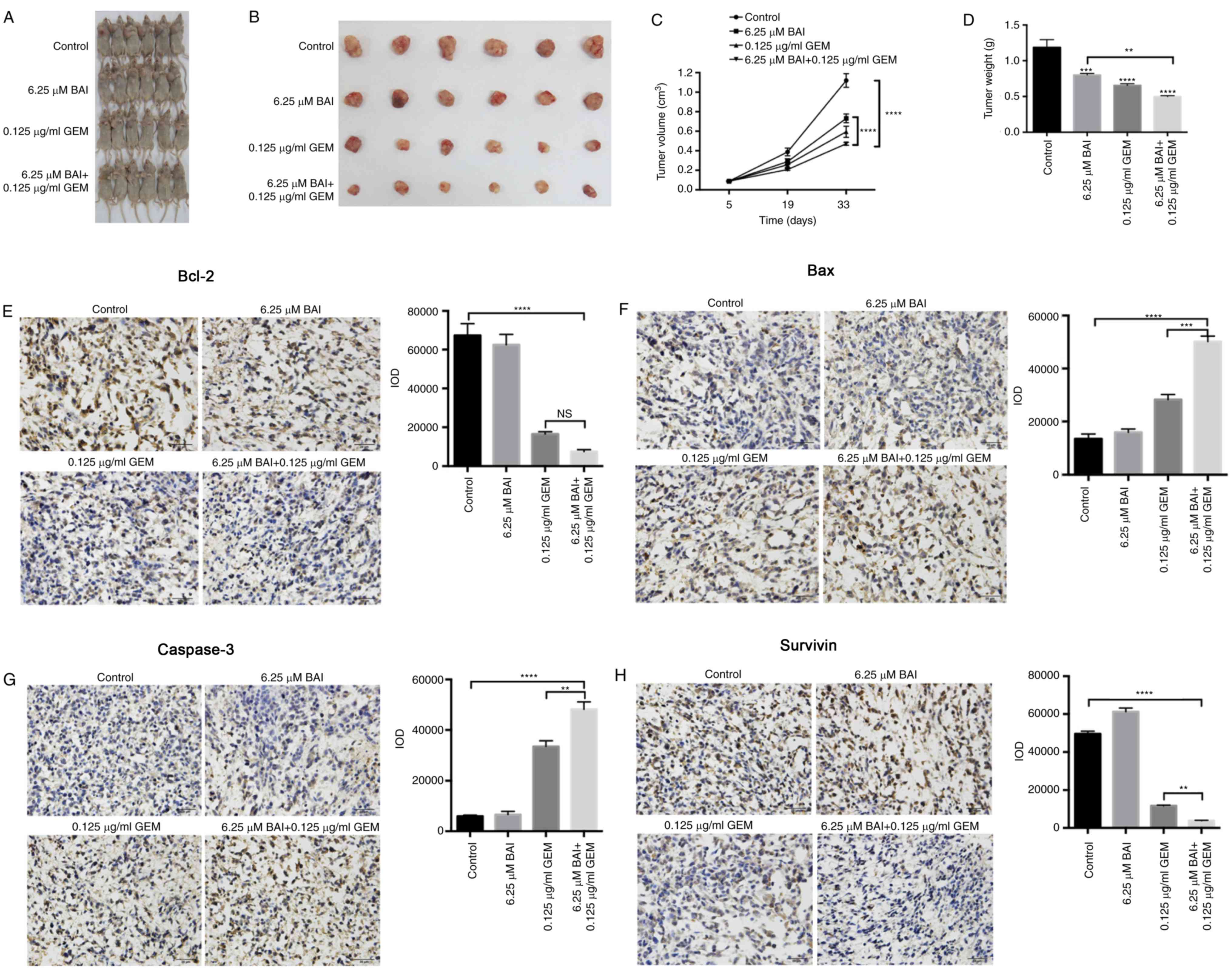 In the CFPAC-1 xenograft nude mouse model, all mice survived the duration of the experiment with no observable toxic effect. Mice were sacrificed after 28 days and the weights and volume of the xenografts were measured. Compared with the control group, xenografts from the mice treated with BAI or GEM therapy were decreased in volume and weight (Fig. 4A and B). Furthermore, the combination therapy consisting of 6.25 µM BAI and 0.125 ug/ml GEM induced a significant decrease in tumor volume and weight compared with the control and with BAI treatment alone (P<0.0001; Fig. 4C and D). Immunohistochemical assays additionally revealed that the protein levels of Bcl-2, survivin, Bax and caspase-3 followed a similar pattern to that of the in vitro experiment, since Bcl-2 and survivin were significantly decreased and Bax and caspase-3 were significantly increased in the combined treatment group compared with the control group (P<0.0001; Fig. 4E-H). Furthermore, survivin, Bax and caspase-3 levels were significantly altered in the combination therapy group compared with the GEM-alone treated group (P<0.01; Fig. 4E-H).