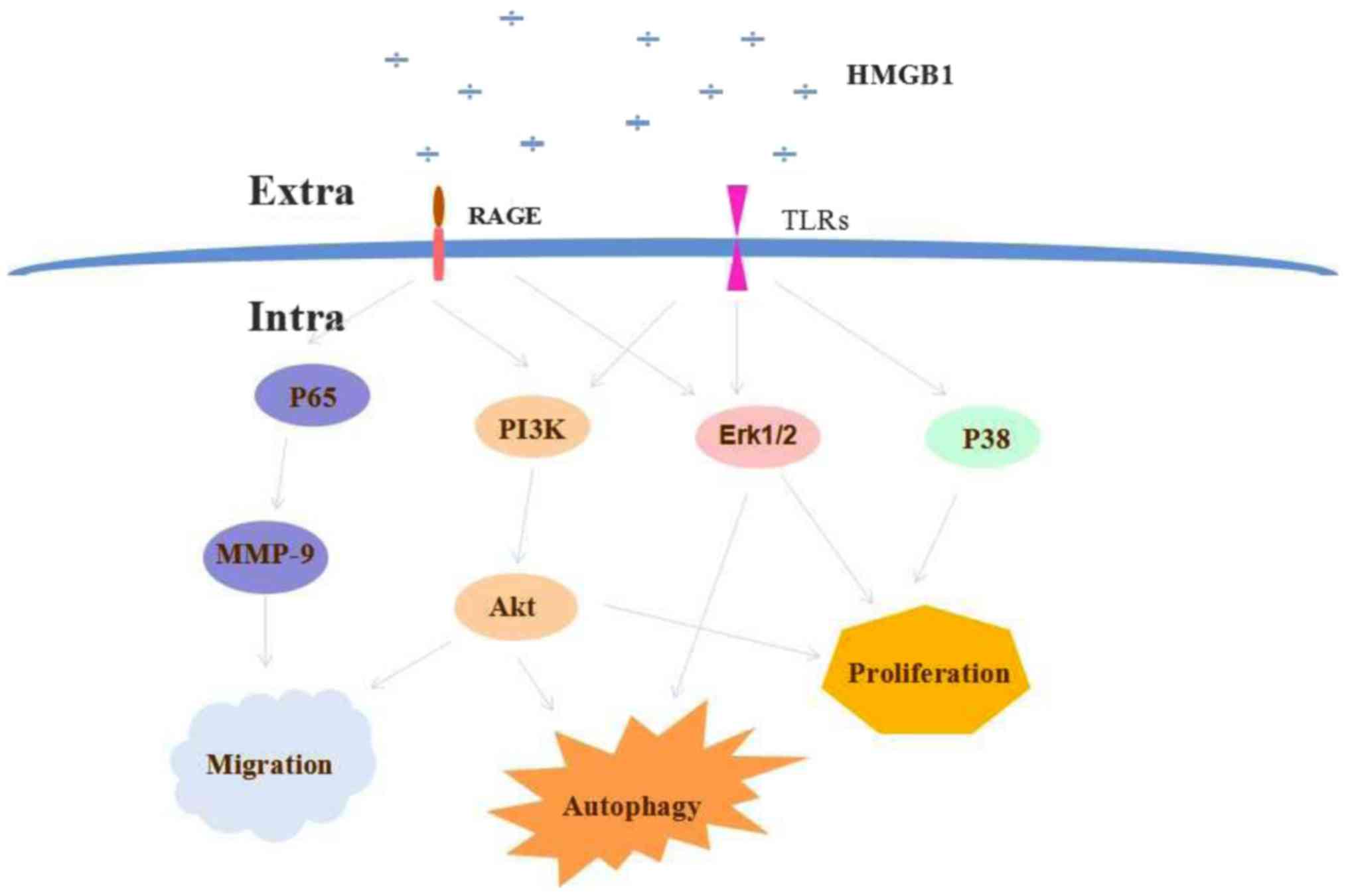 In summary, HMGB1 overexpression is involved in various diseases, including lung cancer. HMGB1 has been demonstrated to induce tumorigenesis, metastasis and chemotherapeutic responses in lung cancer. HMGB1 receptors involved in lung cancer progression include RAGE and TLRs. The effects of HMGB1 are executed via various signaling pathways, including PI3K/Akt, NF-κB (p65) and MAPK (ERK1/2, p38). A schematic illustration of HMGB1 signaling in lung cancer is presented in Fig. 1.