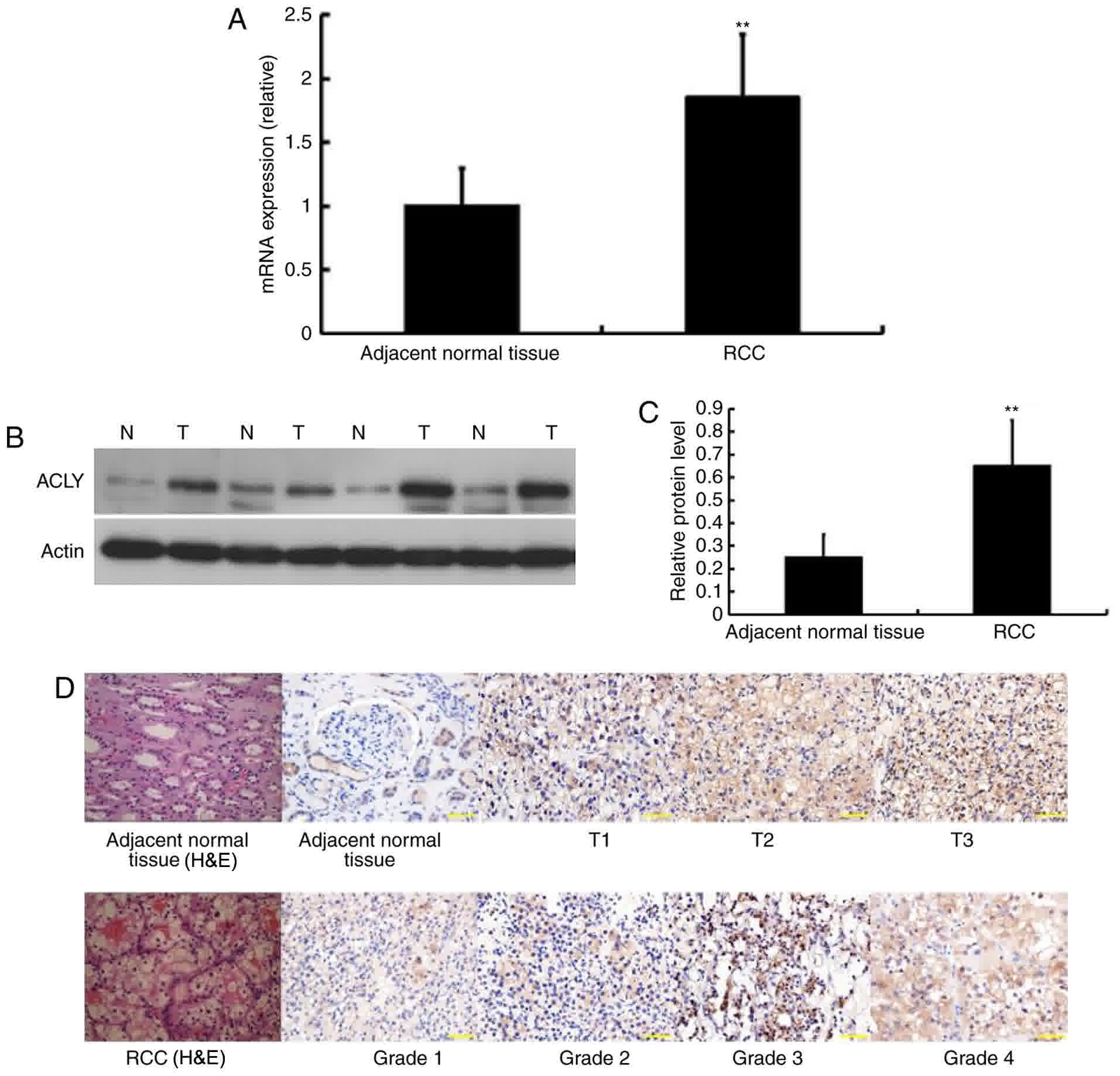 We evaluated the ACLY expression levels at the molecular level using RT-PCR. Mean ACLY mRNA expression in ccRCC was significantly higher when compared with surrounding normal kidney tissue in paired analyses (Fig. 1A).