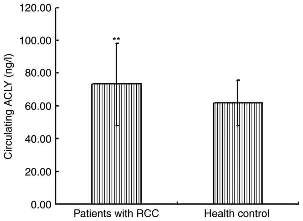 We assessed serum ACLY by ELISA in 10 healthy men and 37 patients with ccRCC. We found that ACLY serum concentrations were significantly higher in patients with ccRCC, compared with healthy controls (Fig. 2). Moreover, serum ACLY concentrations correlated with the TNM stage and Fuhrman grade of ccRCC and could be related to the higher metabolic rate in cancer cells.