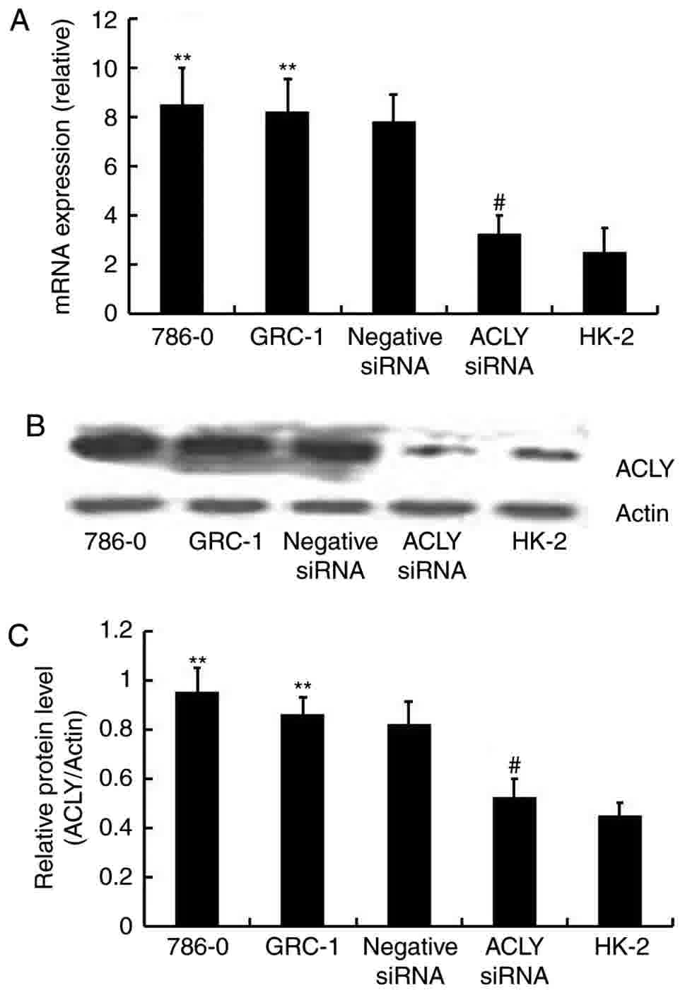 Total RNA was extracted from tissue samples using the TRIzol reagent (Invitrogen, Beijing, China). RT-qPCR was performed using an SYBR Premix Ex Taq™ Reverse Transcription-PCR kit (Takara Bio, Inc., Otsu, Japan). The primers for human ACLY were, while the primers for β-actin were. The method of Livak and Schmittgen (9) and reference ΔCq values were used for calculations of ΔΔCq and all relative quantity values for assessing expression of ACLY mRNA in RCC and adjacent tissue. β-actin was used as internal controls.