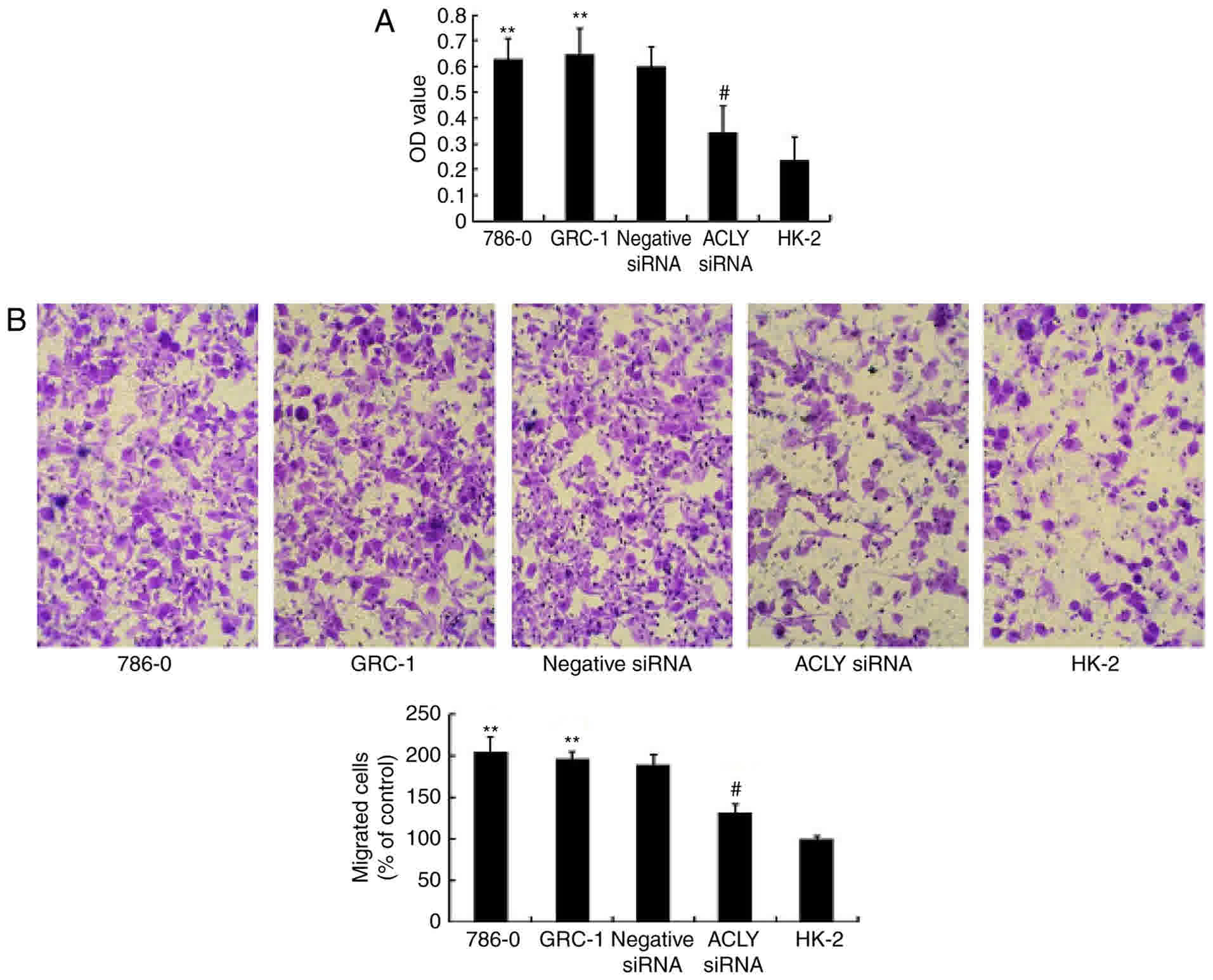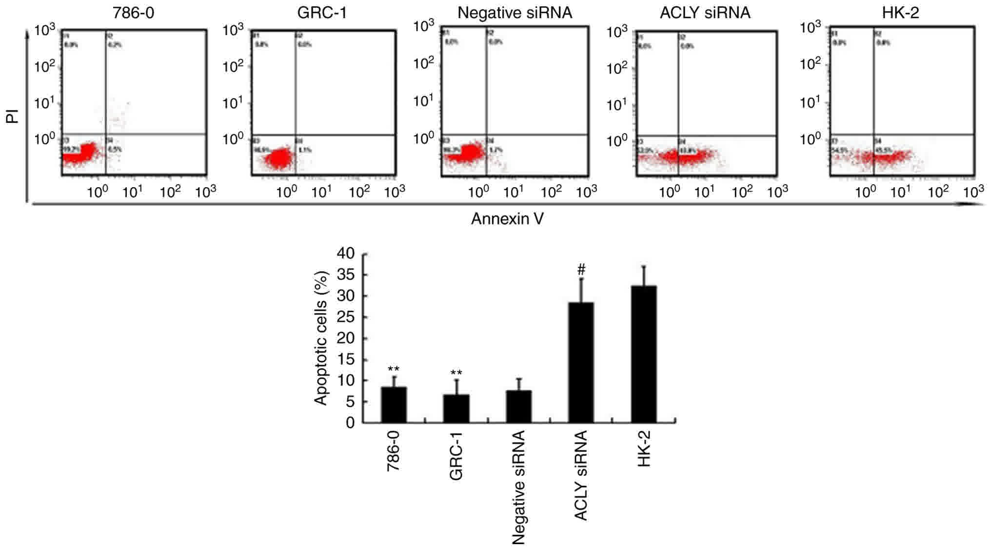 Compared with 786-0, GRC-1, and HK-2 cells, transfected 786-0 cells demonstrated significantly suppressed proliferation (P<0.01; Fig. 4A), and fewer transfected 786-0 cells migrated through the transwell compared with negative controls, (P<0.05 Fig. 4B). And, flow cytometry showed in Fig. 5, that RCC knocked down with ACLY promotes apoptosis as compared with transfected HK-2 or non-transfected RCC.