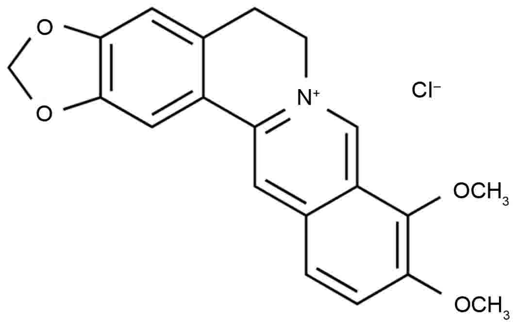 Human NSCLC A549 cells were obtained from The Cell Bank of Type Culture Collection of Chinese Academy of Sciences (Shanghai, China) and cultured in Dulbecco's modified Eagle's medium (Cellgro; Corning Incorporated, Corning, NY, USA) supplemented with 10% fetal bovine serum (Gibco; Thermo Fisher Scientific, Inc.), 100 U/ml penicillin and 100 µg/ml streptomycin, in a humidified atmosphere with 5% CO2 at 37°C. The chemical structure of berberine hydrochloride (Sigma-Aldrich; Merck Millipore, Darmstadt, Germany) is presented in Fig. 1.