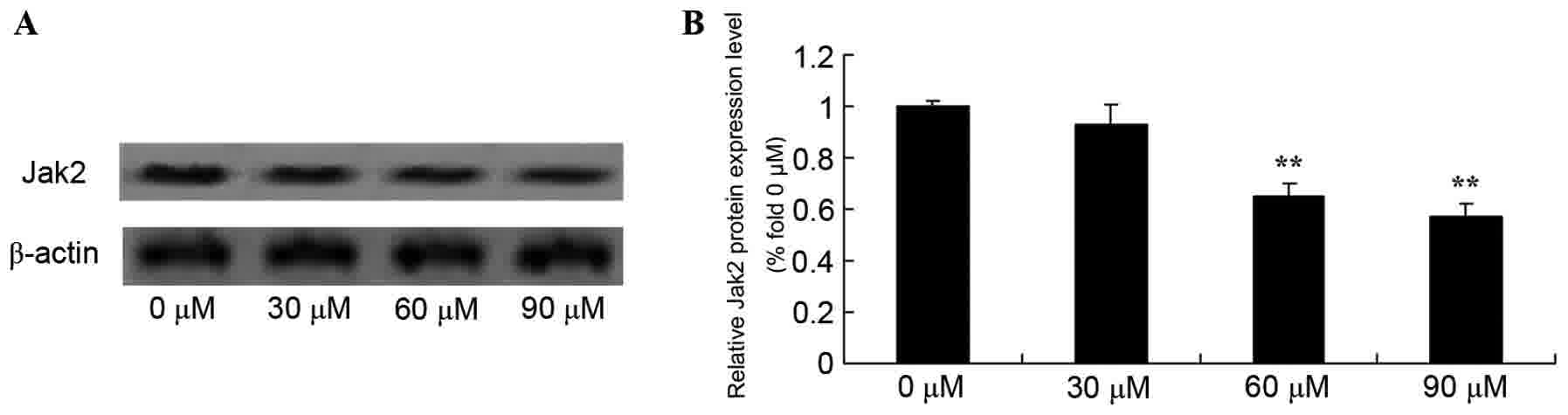 In order to determine the anticancer effect of berberine hydrochloride treatment on the protein expression levels of the apoptosis signaling molecules, A549 cells were treated with berberine hydrochloride for 24 h and analyzed using western blotting. It was revealed that berberine hydrochloride treatment at 60 and 90 µM significantly inhibited Jak2 protein expression level in A549 cells, compared with control group (Fig. 6; P=0.0082 and P=0.0068, respectively).
