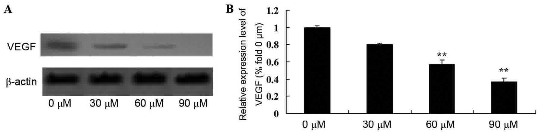In order to determine the association between the VEGF signaling pathway and the anticancer effect of berberine hydrochloride on lung cancer, changes in expression of VEGF protein were analyzed following treatment of A549 cells with various concentrations (0–90 µM) of berberine hydrochloride. As presented in Fig. 7, VEGF expression was significantly inhibited following treatment with 60 and 90 µM berberine hydrochloride (P=0.0061 and P=0.0028, respectively).