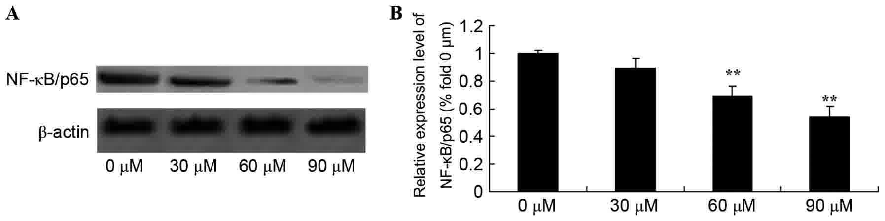 In order to confirm the anticancer effect of berberine hydrochloride on NF-κB protein expression levels in A549 cells, NF-κB/p65 protein expression levels were determined by western blot analysis. As indicated in Fig. 8, NF-κB/p65 protein expression level was significantly inhibited by 60 and 90 µM berberine hydrochloride treatment for 24 h, compared with the control group (P=0.0045 and P=0.0017, respectively).