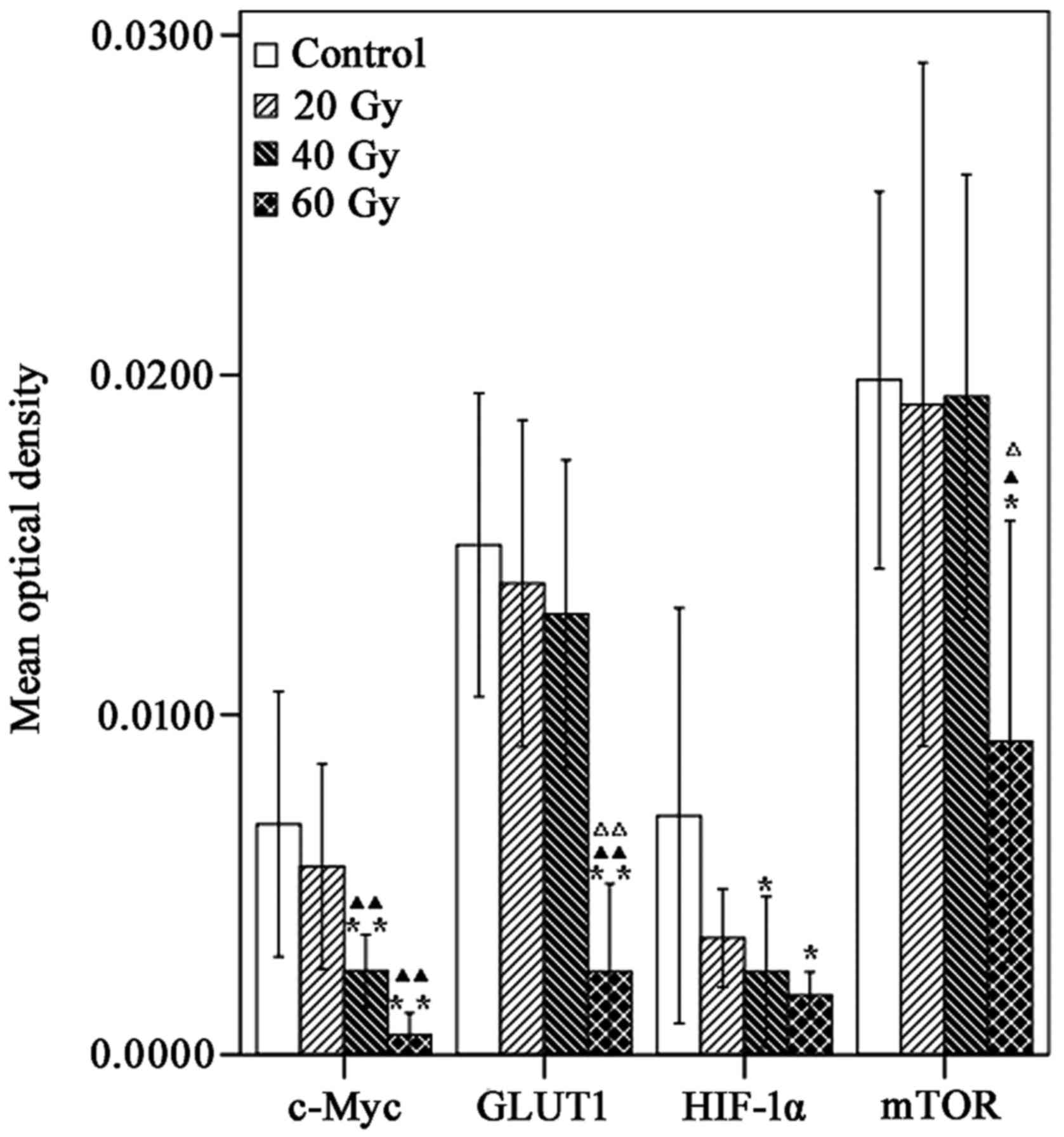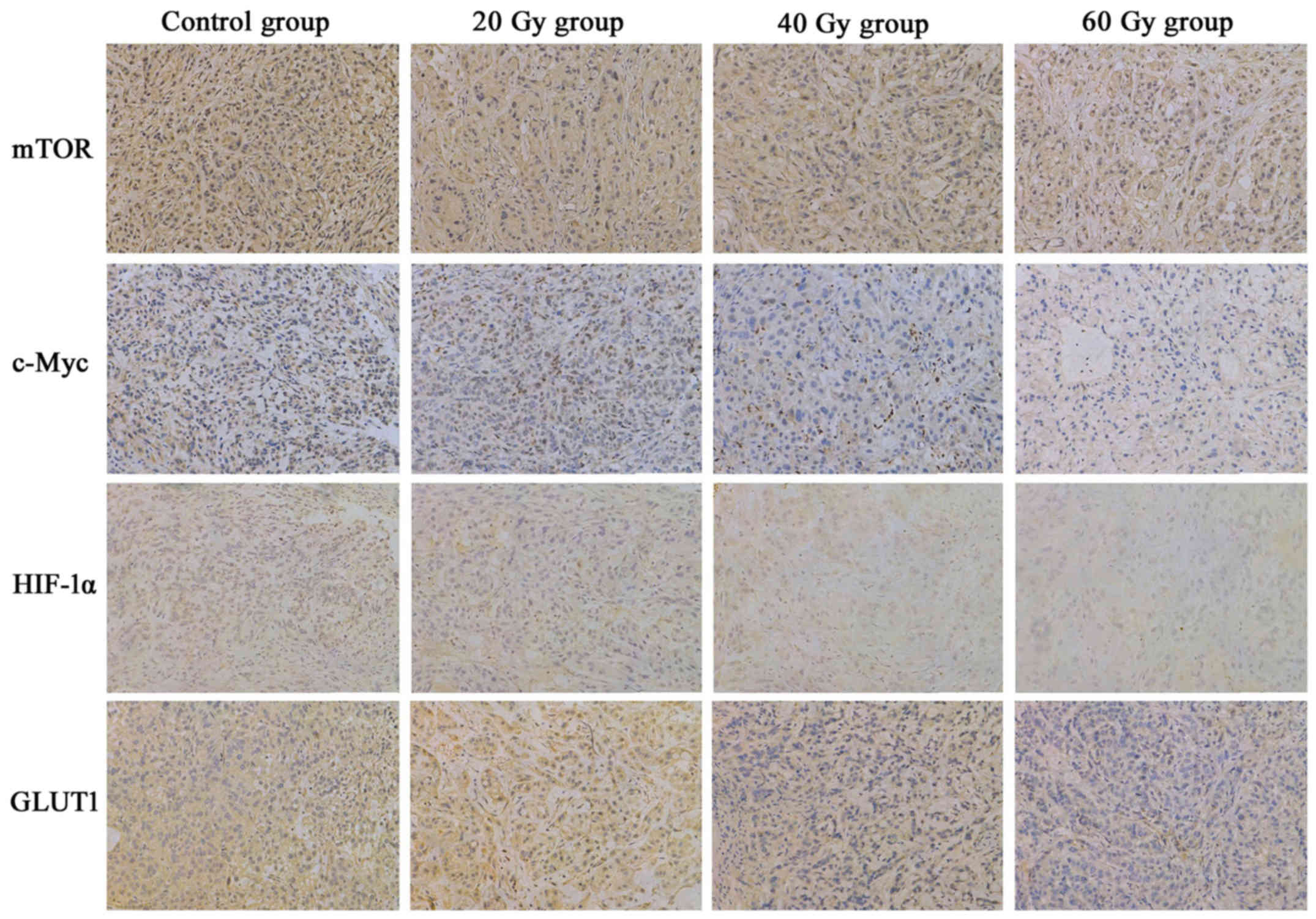 In the present study, alterations in mTOR, c-Myc, HIF-1α and GLUT1 expression was analyzed by IHC techniques, and the relationship among them was determined. The findings revealed that the xenograft expression of mTOR, c-Myc, HIF-1α and GLUT1 decreased as the radiation dose increased, with the largest decrease observed in the 60 Gy group, compared with the controls. Furthermore, the ESRmTOR, ESRc-Myc, ESRHIF-1α and ESRGLUT1 was dose-dependently increased, and the MOD of mTOR, c-Myc and GLUT1 were significantly correlated with each other. These findings indicated that the Warburg effect was inhibited by 125I-IBT, which may have resulted from mTOR, c-Myc, HIF-1α and GLUT1 downregulation in NSCLC A549 ×enografts.