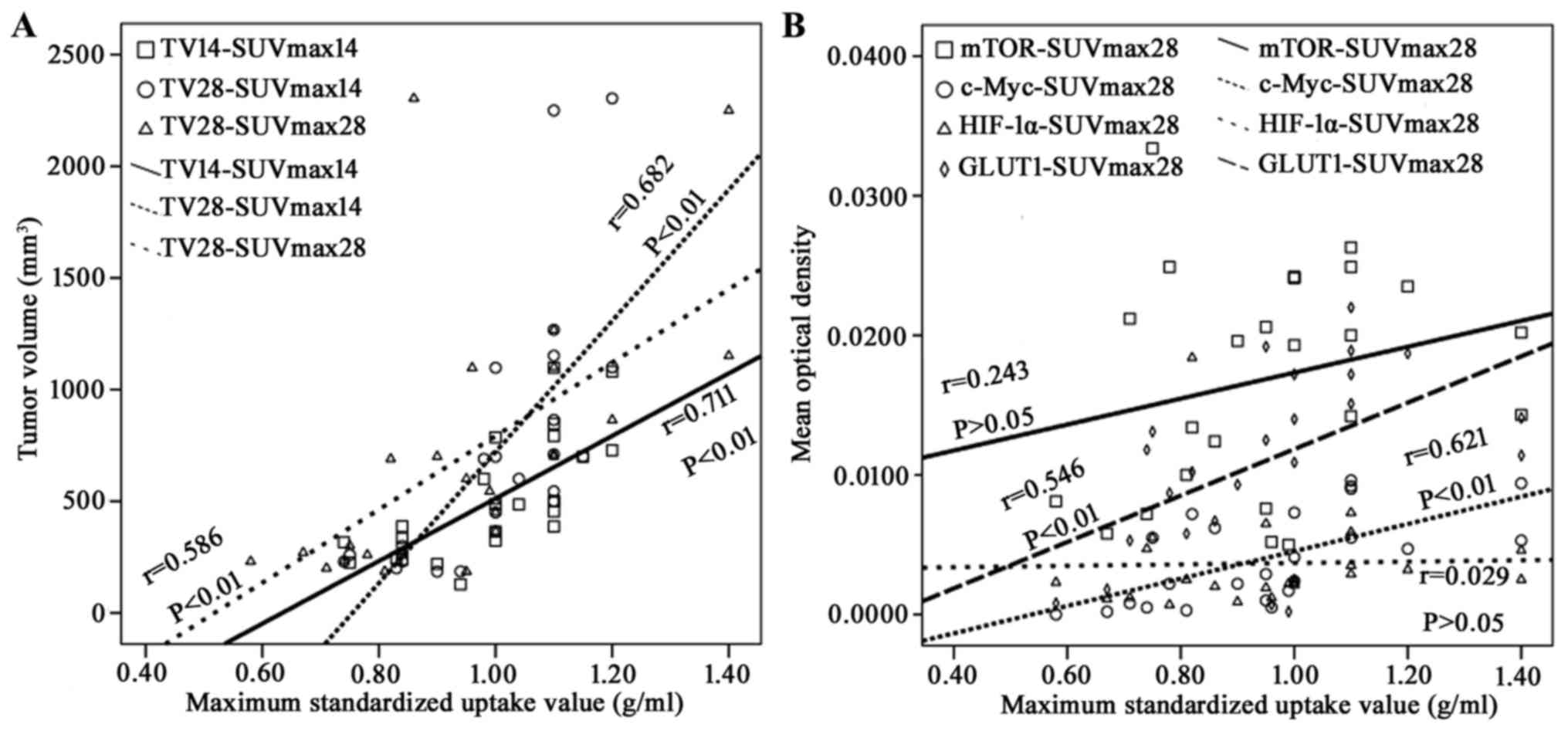 All statistical analyses were performed using SPSS 19.0 software (IBM Corp., Armonk, NY, USA). The continuous variables were described as the mean ± standard deviation. Significant differences were evaluated using one-way analysis of variance. If variances were equal, all pairwise comparisons between group means were performed with Fisher's Least Significant Difference test; if unequal, Dunnett's T3 test was used. Pearson's correlation analysis was used to evaluate the relationships among TV, SUVmax and the MOD of mTOR, c-Myc, HIF-1α and GLUT1. P<0.05 was considered to indicate a statistically significant difference.