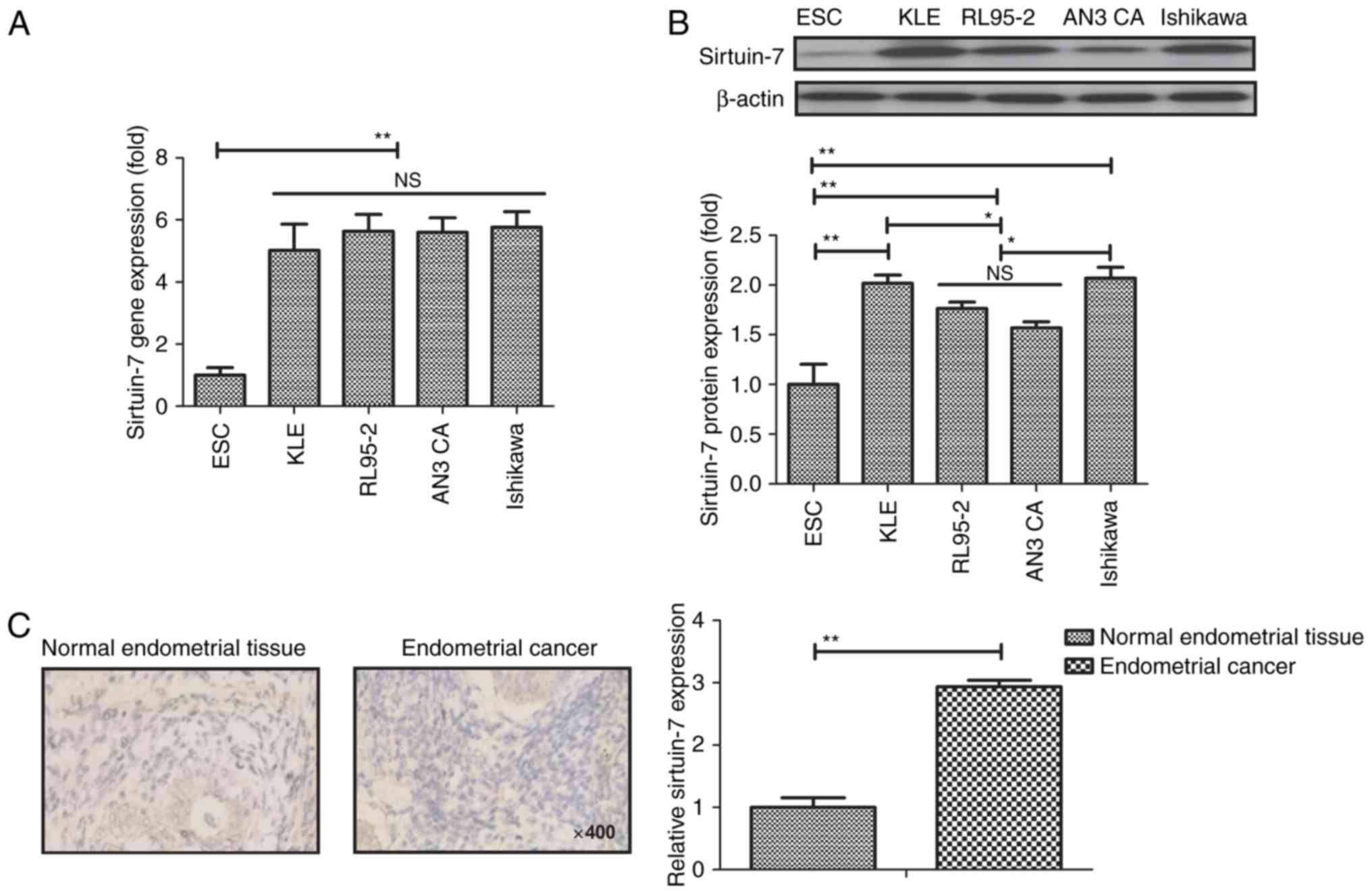 To determine the role of sirtuin-7 in endometrial cancer, the mRNA and protein levels of all sirtuin-7 were examined in endometrial cancer cell lines (KLE, RL95-2, AN3 CA and Ishikawa) and compared with ESCs. Results revealed that sirtuin-7 gene was higher in endometrial cancer cell lines compared with normal primary endometrial cells (P<0.01; Fig. 1A). Western blot analysis also demonstrated that sirtuin-7 protein expression was higher in endometrial cancer cell lines compared with normal primary endometrial cells (P<0.01; Fig. 1B). The expression of sirtuin-7 was significantly higher in endometrial cancer tissues compared with normal tissues (P<0.01; Fig. 1C). These results suggest that sirtuin-7 may be a potential target for the treatment of endometrial cancer.