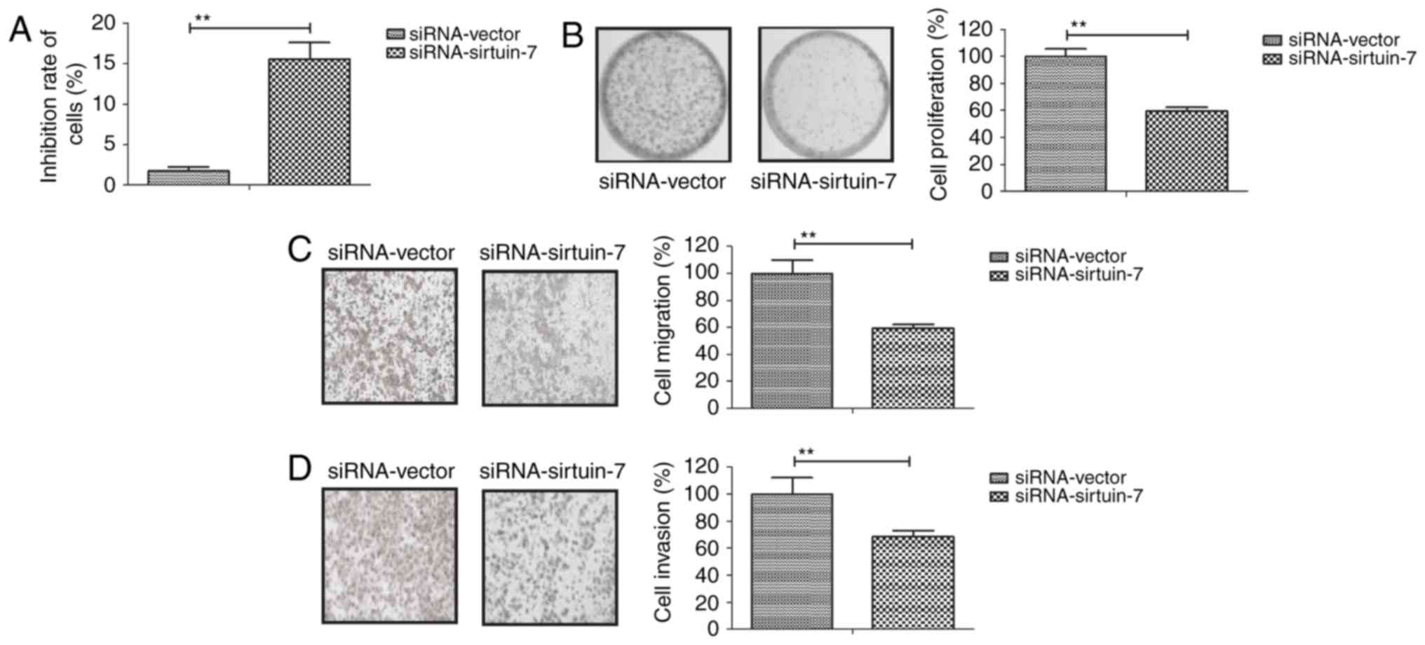To gain further insights into the role of sirtuin-7 in endometrial cancer cells, sirtuin-7 expression was downregulated in Ishikawa cells. As indicated in Fig. 2A, siRNA-induced knockdown of sirtuin-7 was able to significantly inhibit the growth of Ishikawa cells compared with the control. The downregulation of sirtuin-7 was also able to inhibit the proliferation of Ishikawa cells (Fig. 2B). Furthermore, the knockdown of sirtuin-7 was able to suppress the migration and invasion of Ishikawa cells (Fig. 2C and D). These results suggest that the downregulation of sirtuin-7 is able to inhibit the growth and metastasis of endometrial cancer cells.