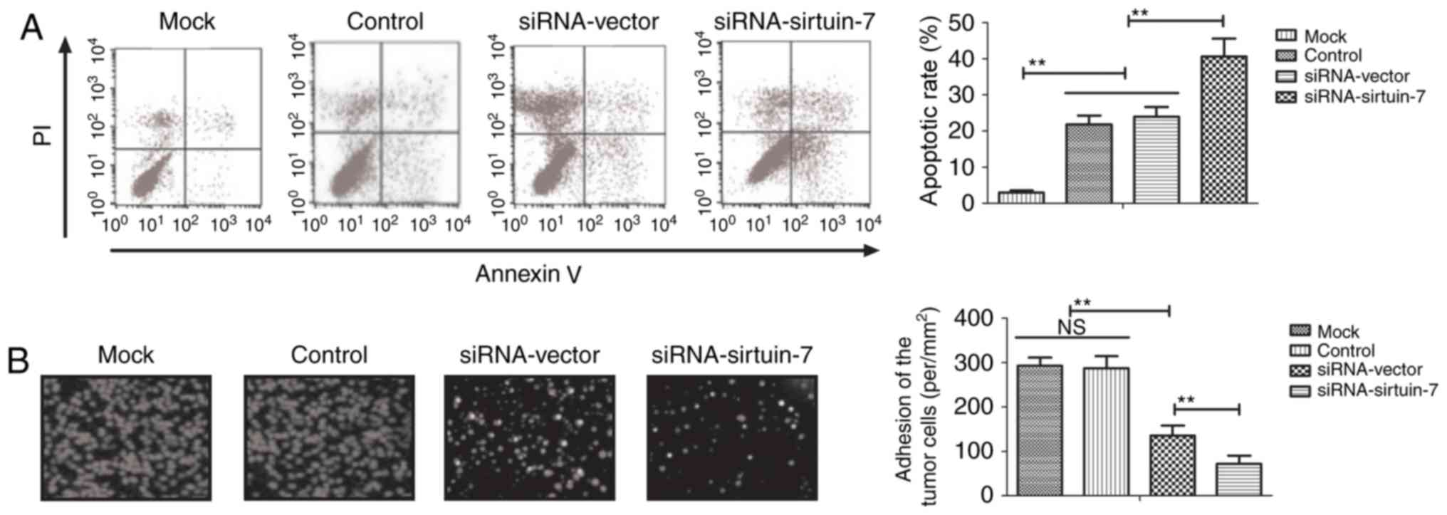 Ishikawa cells (1×106/well) were seeded in 6-well plates for 12 h at 37°C in a humidified incubator at 5% CO2. The cells, siRNA-sirtuin-7 or siRNA-vector were then incubated with cisplatin (Control, 5.0 mg/ml) or PBS (Mock) for 24 h at 37°C. The cells were removed, collected and washed with phosphate buffer solution (PBS) three times. Subsequently, Ishikawa cells were incubated with fluorescein isothiocyanate (FITC)-conjugated Annexin V and propidium iodide (PI) for 2 h at room temperature, using an Annexin V-FITC Apoptosis Detection kit (BD Biosciences) and according to the manufacturer's protocol. Flow cytometry was used to analyze the percentage of apoptotic Ishikawa cells by using FCS Express™ 4 IVD (De Novo Software, Glendale, CA, USA).