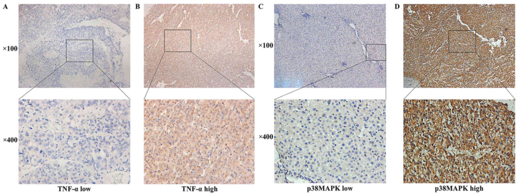 As described previously (21), two pathologists at the Affiliated Hospital of Qingdao University (Qingdao, China) who had been blinded to the clinical data interpreted the results simultaneously. Under a light microscope, markedly stained cells exhibited brown staining in the cytoplasm. Overall, 10 fields were observed under high magnification (magnification, ×400), and the degree of immunostaining was reviewed and scored according to the intensity of staining and the percentage of immunoreactive cells. Staining intensity was graded according to the following criteria: Cells without staining were scored as 0, whereas that stained light yellow, yellowish brown and brown were scored as 1, 2 and 3 points, respectively. The extent of immunoreactivity was graded as follows: <5%, ≥5%, ≥26%, ≥51% and ≥75% were scored as 0, 1, 2, 3 and 4 points, respectively. The two scores were summed, and a total score of ≤4 represented low expression, whereas >4 represented high expression. All patients were divided into high- and low-expression groups according to the IHC score results. Patients with high expression levels of both TNF-α and p38MAPK were included in the high-expression group, whereas those with low expression of both TNF-α and p38MAPK were included in the low-expression group. Patients with high TNF-α and low p38MAPK expression and patients with low TNF-α and high p38MAPK expression were included in the TNF-α high-expression group and the p38MAPK high-expression group, respectively. Representative images are presented in Fig. 1.