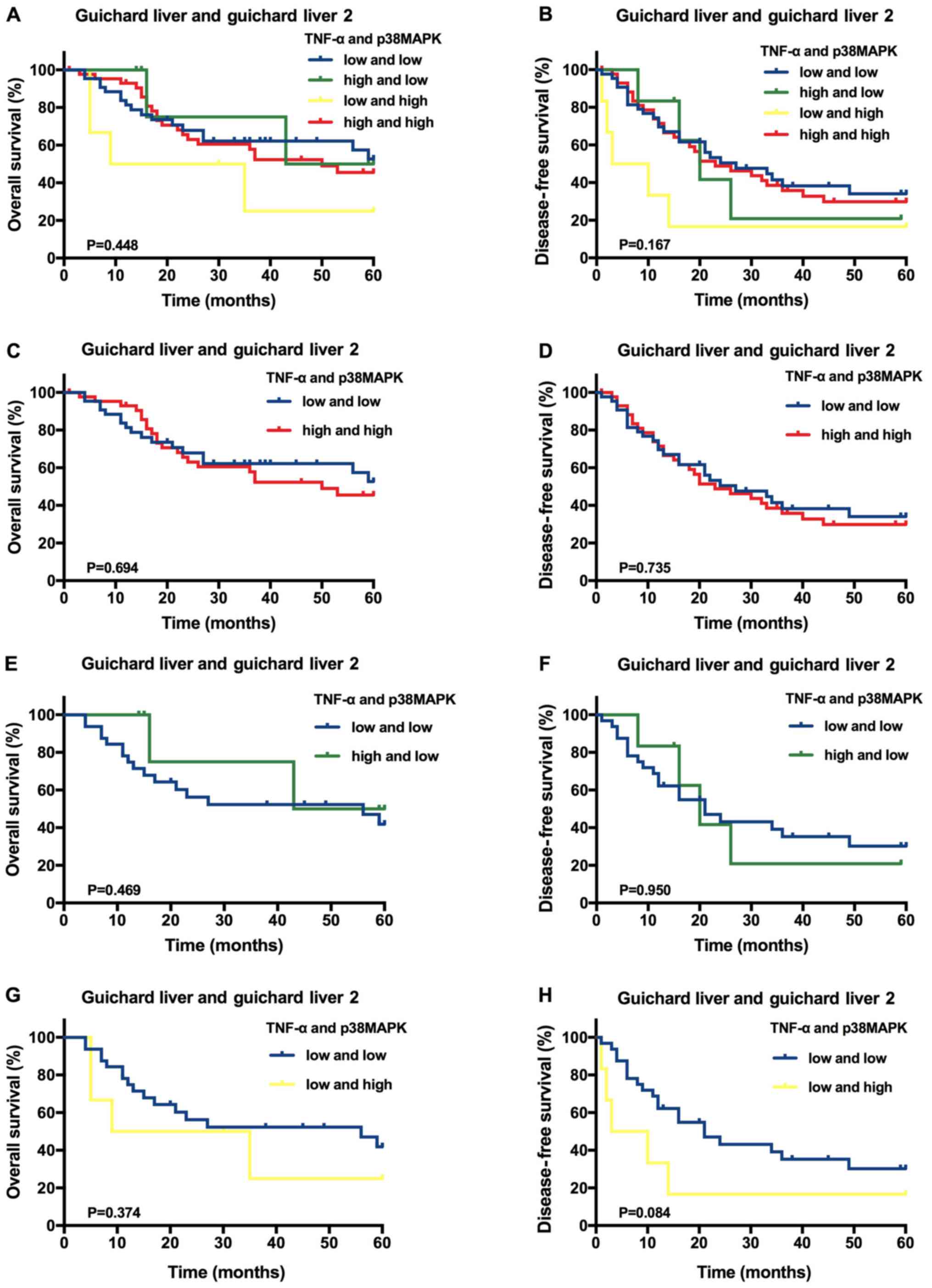 However, in the tissues from patients with T1N0M0 HCC, the average follow-up time was 44.85±24.11 months (range, 4.0–114.5 months), and the 1-, 3- and 5-year OS rates were 90.36, 66.27 and 31.33%, respectively. The DFS rates at 1, 3 and 5 years were 53.01, 36.14 and 19.28%, respectively. A Kaplan-Meier analysis of 83 patients with T1N0M0 HCC indicated significantly improved OS (P=0.003) and DFS (P=0.027) rates for the group with high levels of both TNF-α and p38MAPK expression compared with the other groups (Fig. 3A and 3B). On the basis of these results, another Kaplan-Meier analysis was performed using 83 patients with T1N0M0 HCC. Patients with high expression levels of both TNF-α and p38MAPK had higher OS (P=0.002) and DFS (P=0.004) rates compared with patients with low expression levels of both TNF-α and p38MAPK (Fig. 3C and D). Furthermore, the patients with high TNF-α expression alone had improved OS (P=0.012) and DFS (P=0.012) rates compared with patients with low expression levels of both TNF-α and p38MAPK (Fig. 3E and F). The patients with high p38MAPK expression alone had higher OS (P=0.005) and DFS (P=0.004) rates compared patients with low expression levels of both TNF-α and p38MAPK (Fig. 3G and H).