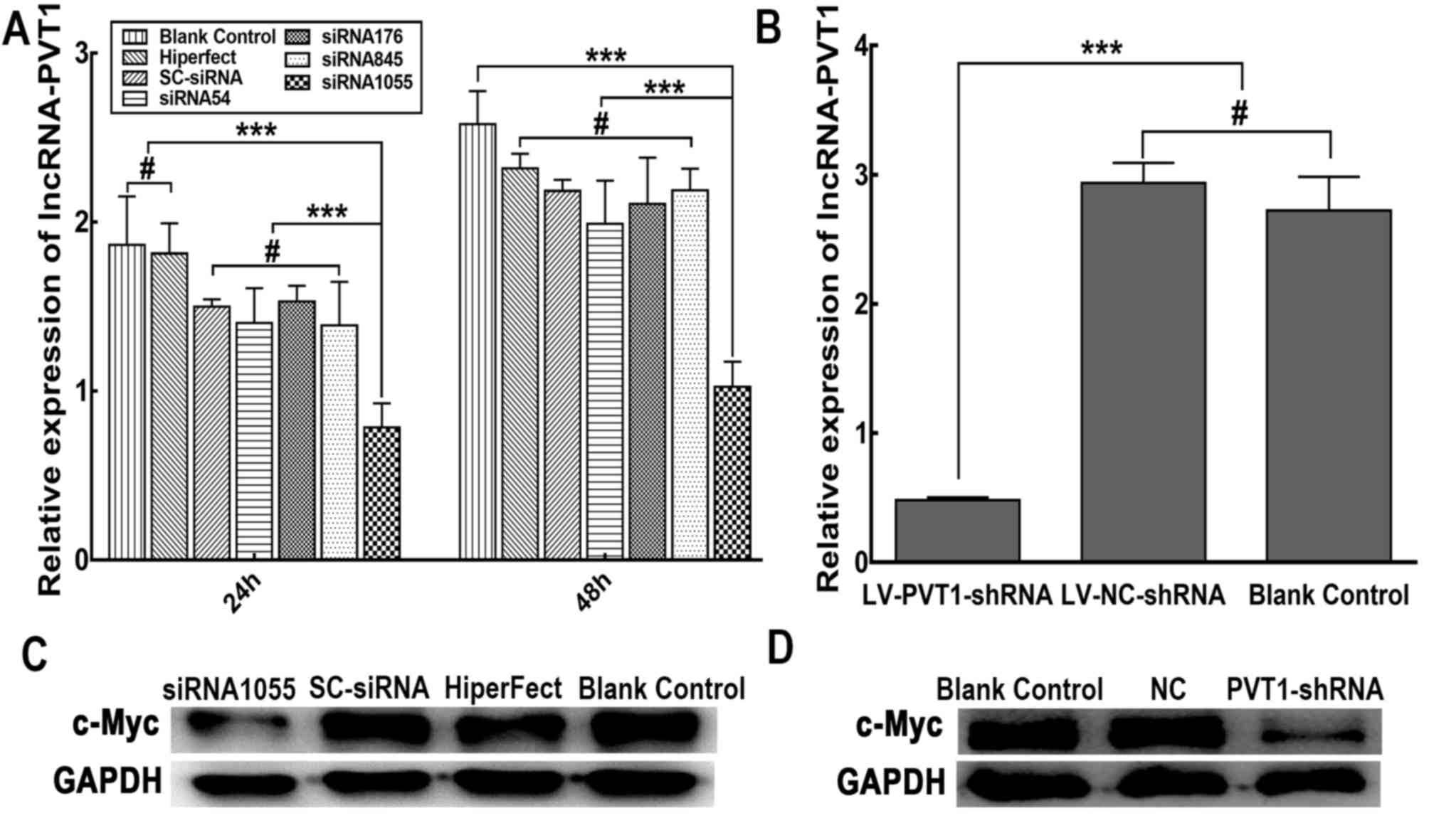 The Raji cell line was purchased from the Cell Bank of Type Culture Collection of Chinese Academy of Sciences (Shanghai, China. http://www.cellbank.org.cn/index.asp). Cells were cultured in RPMI-1640 medium (Gibco; Thermo Fisher Scientific, Inc., Waltham, MA, USA), supplemented with 10% heat-inactivated foetal bovine serum (FBS; Gibco; Thermo Fisher Scientific, Inc.) at 37°C in a humidified incubator with 5% CO2. Four small interfering RNA (siRNA) sequences targeting PVT1 (siRNA54, siRNA176, siRNA845, siRNA1055) and a scrambled control (SC) siRNA were designed and synthesized by Shanghai GenePharma Co., Ltd. (Shanghai, China). The sequences of the siRNA are as follows: PVT1-siRNA54: 5′-CCUGAUGGAUUUACAGUGATT-3′, PVT1-siRNA176: 5′-GCUGAAUGCCUCAUGGAUUTT-3′, PVT1-siRNA845: 5′-CCUGUUACACCUGGGAUUUTT-3′, PVT1-siRNA1055: 5′-GCUUCUCCUGUUGCUGCUATT-3′, SC-siRNA: 5′-GCUACGAUCUGCCUAAGAUTT-3′. Raji cells (3–4×105 cells/ml) in the exponential growth phase were grown for 24 h, then PVT1-siRNA54, -siRNA176, -siRNA845 and-siRNA1055 were transfected into Raji cells using HiPerfect (Qiagen, Inc., Valencia, CA, USA) according to the manufacturer's protocol. In addition to non-silencing SC siRNA control, cells in the mock transfection group were treated with HiPerfect agents only. The total concentration of siRNA applied in eachcase was 100 nM. At 24 and 48 h post-transfection, silencing of PVT1 RNA was examined.