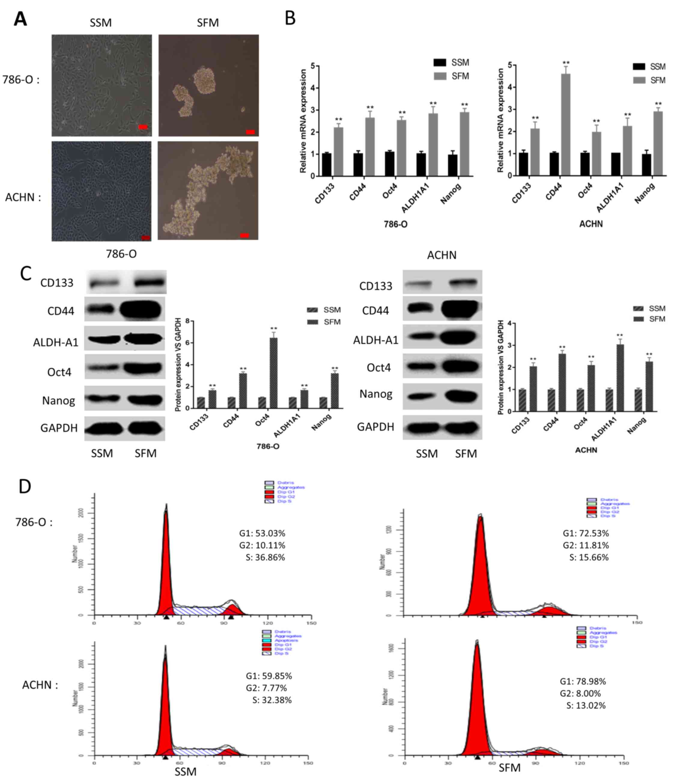 A number of studies have reported that CSCs have the ability to grow in suspension and to form spheres through culturing under SFM conditions (10,25,26). Therefore, a tumor sphere formation assay via culturing in SFM is an efficient way to isolate and enrich CSCs. In the present study, 786-O and ACHN cell lines were able to form stable cell spheres following culturing in SFM for 5 days (Fig. 1A). To further elucidate the CSC characteristics of the sphere-forming cells, mRNA and protein expression levels of renal CSC markers, including Nanog, Oct4, ALDH1A1, CD44 and CD133, were detected. Following culturing under SFM conditions for 5 days, the mRNA and protein expression levels of CSC markers were markedly upregulated compared with adherent cells cultured under SSM conditions (Fig. 1B and C). Furthermore, FCM analysis of the cell cycle distribution suggested that the sphere-forming cells were primarily arrested at G0/G1 phase instead of S1 phase, in contrast to the adherent cells (Fig. 1D). These results illustrated the CSC characteristics of the cells cultured under SFM conditions.