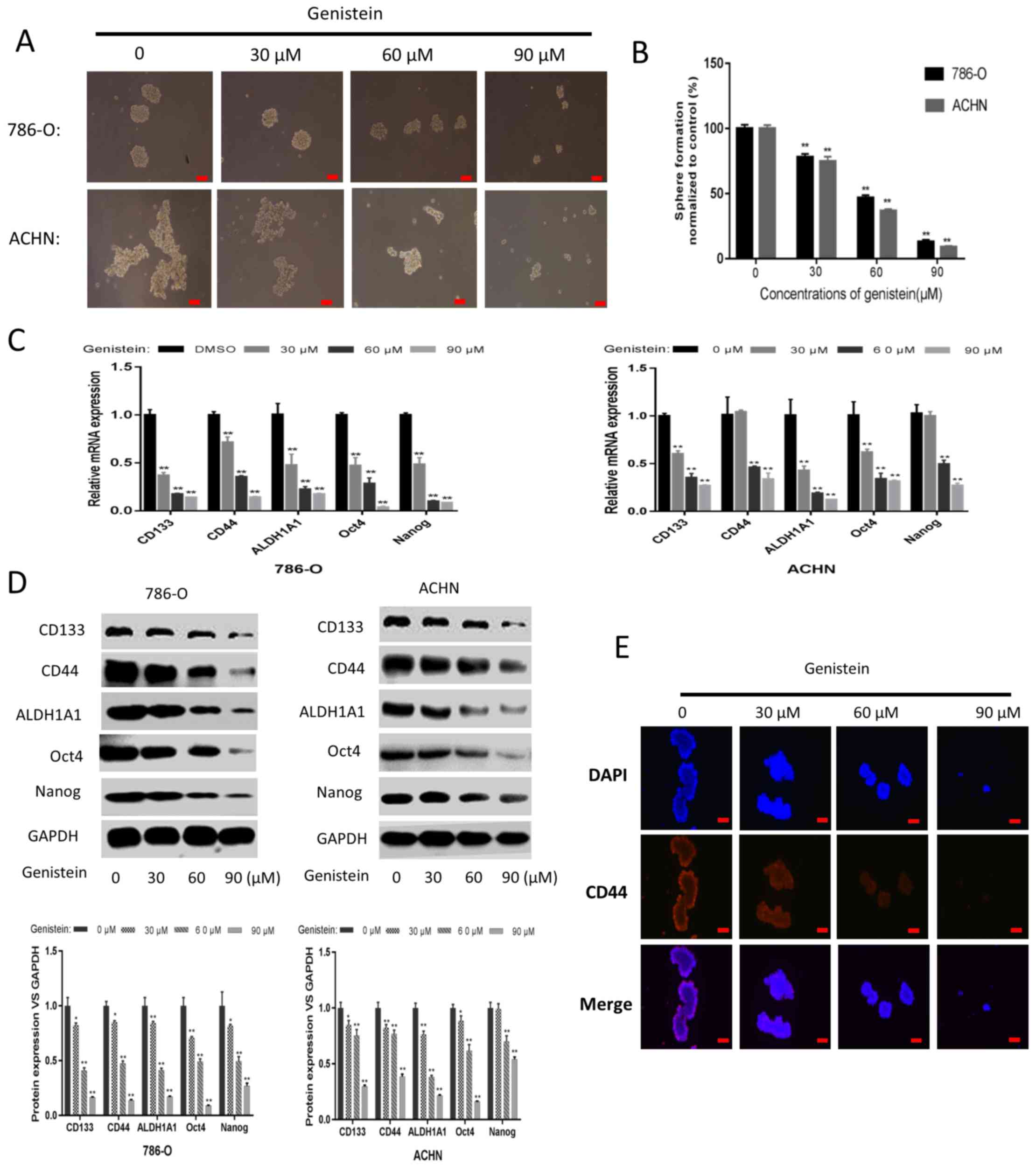Genistein has been demonstrated to target CSCs in several types of malignancy (20,23,27). In the present study, 786-O and ACHN sphere-forming cells were treated with genistein at different concentrations (0, 30, 60 and 90 µM) for 5 days, in order to investigate whether genistein could exhibit its suppressive effect on renal CSCs. As presented in Fig. 2A and B, the tumor sphere formation assay revealed that genistein-treatment could, in a dose-dependent manner, significantly reduce the number and size of sphere-forming cells in the two cell lines. Following treatment with genistein for 5 days, the mRNA and protein expression levels of renal CSC markers were markedly downregulated in the sphere-forming cells of the two cell lines (Fig. 2C and D). In addition, immunofluorescent staining indicated that the number of CD44-positive 786-O sphere-forming cells was decreased following genistein treatment in a dose-dependent manner (Fig. 2E). Overall, these data revealed that genistein could effectively diminish the characteristics of renal CSCs.