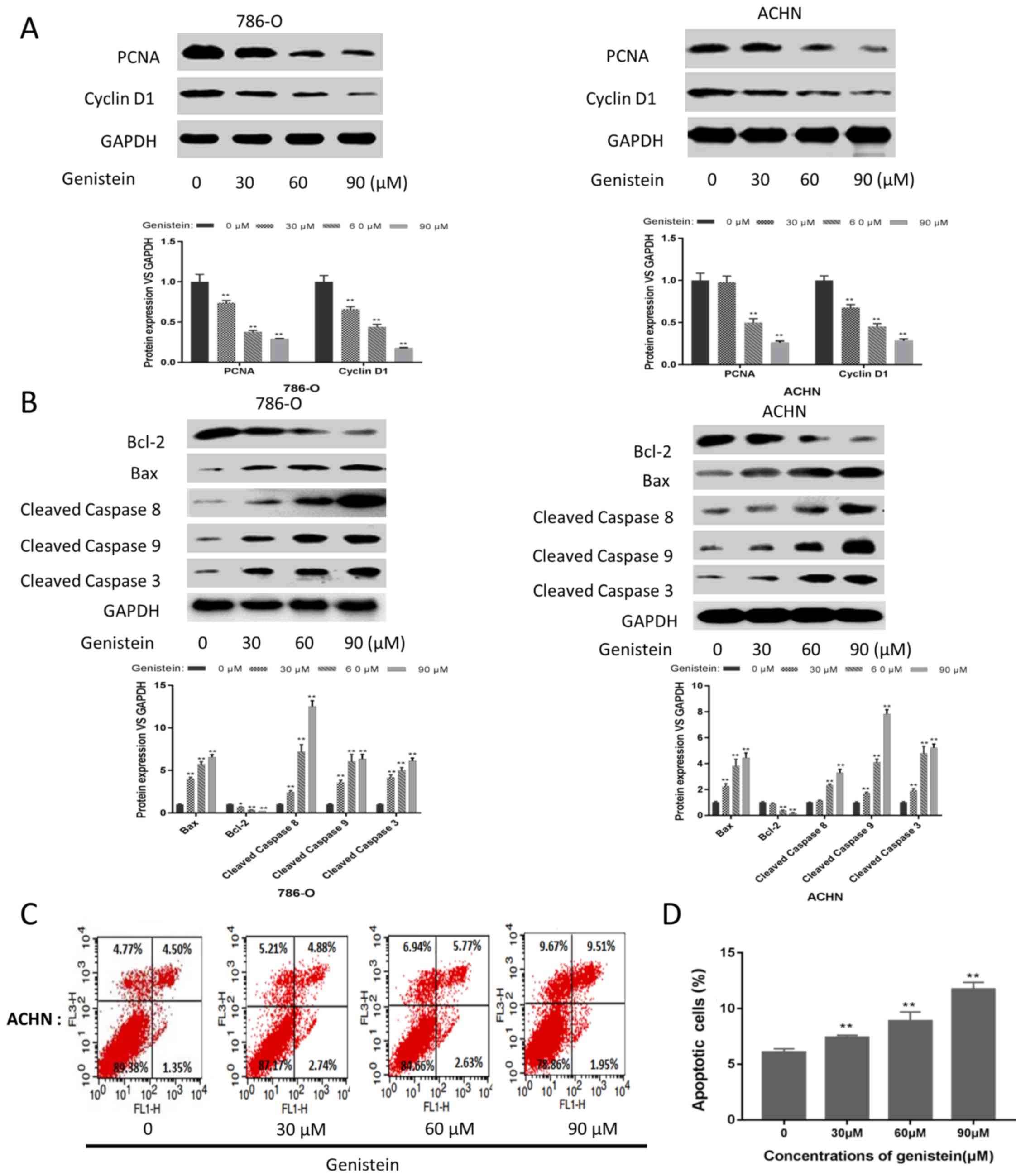 Furthermore, the effects of genistein on cell proliferation and apoptosis were investigated in the present study. As presented in Fig. 3A, the expression levels of proliferation-associated proteins, including PCNA and cyclin D1, were markedly downregulated in the 786-O and ACHN sphere-forming cells following genistein treatment. Additionally, the expression level of the anti-apoptotic protein Bcl-2 was decreased, while the expression levels of the pro-apoptotic proteins Bax, cleaved caspase 8, cleaved caspase 9 and cleaved caspase 3 were markedly upregulated following genistein-treatment (Fig. 3B). In addition, FCM indicated that genistein could significantly induce apoptosis in ACHN sphere-forming cells (Fig. 3C and D). These results revealed that genistein could inhibit the proliferation and induce the apoptosis of renal CSCs.