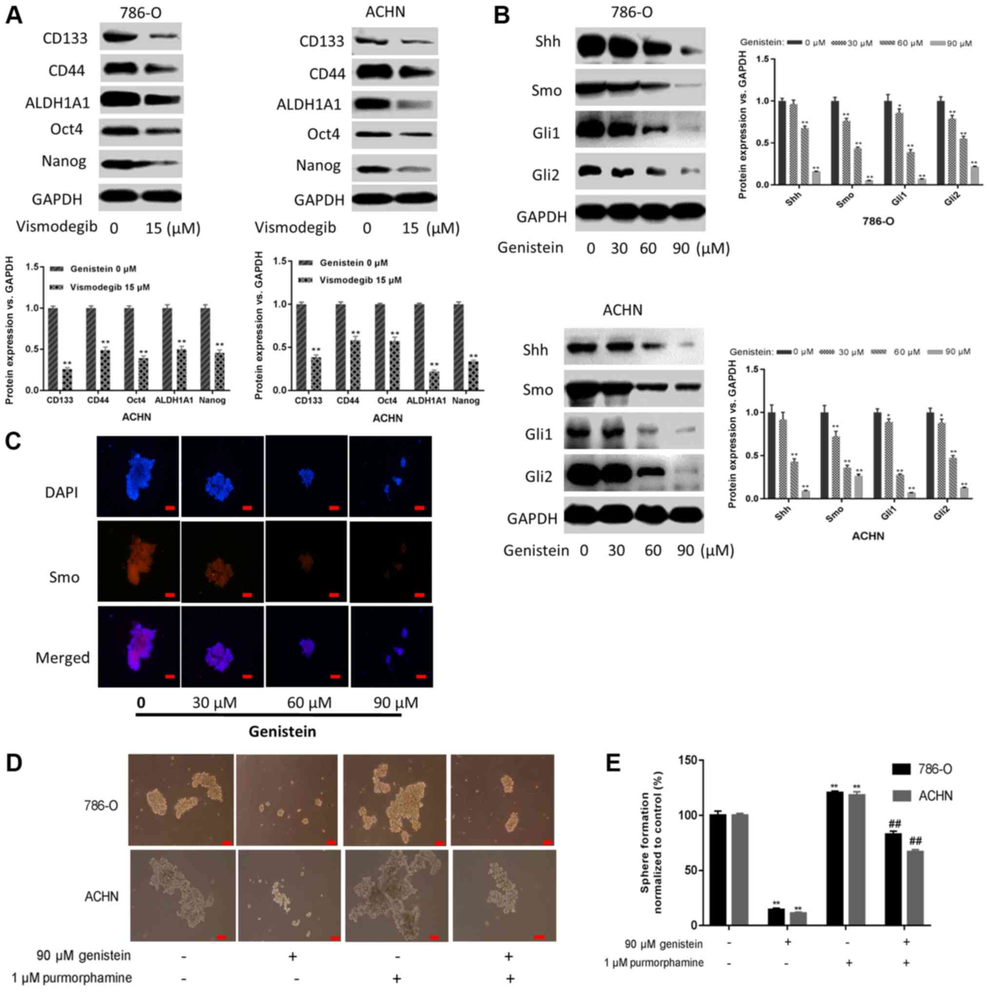 However, to the best of our knowledge, the anticancer properties of genistein against renal CSCs remain to be elucidated. Therefore, the aim of the present study was to evaluate the anticancer effects of genistein on renal CSCs, and to evaluate whether the Shh pathway may be involved in the genistein-induced anticancer activity. The findings of the present study may provide valuable avenues in the search for a potential interventional target of genistein in renal CSCs.
