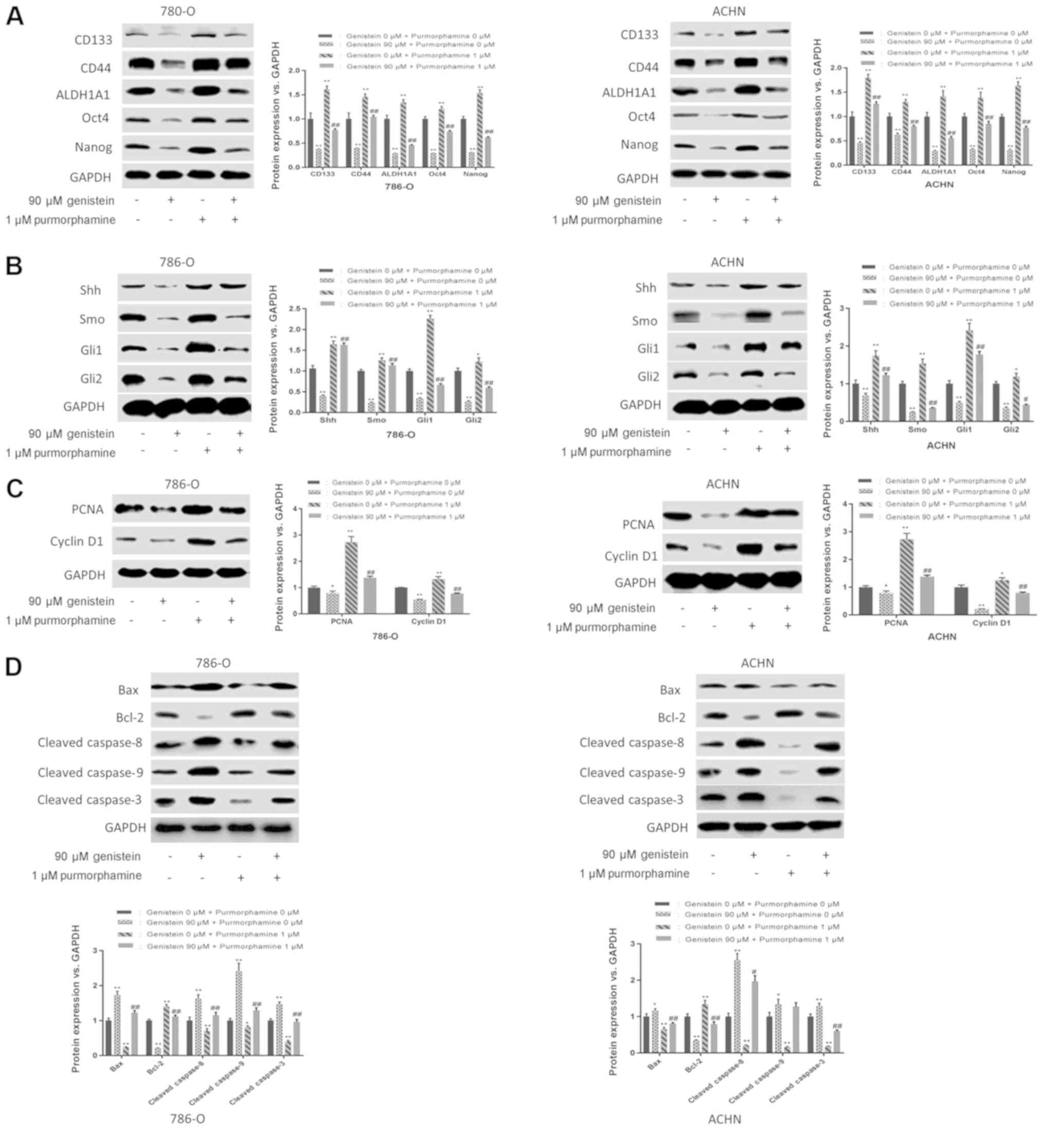 In addition, purmorphamine, an activator of Smo that activates the Shh pathway, was used to further determine the role of the Shh pathway in the suppressive effect exerted by genistein on renal CSCs. The results of the present study revealed that purmorphamine could reverse the suppressive effects of genistein on sphere formation (Fig. 4D and E). Additionally, purmorphamine-treatment increased the expression levels of renal CSC markers in 786-O and ACHN sphere-forming cells and reversed the inhibitory effect of genistein on the Shh pathway (Fig. 5A and B). Furthermore, the inhibitory effects of genistein on cell proliferation and apoptosis-associated proteins were reversed following purmorphamine-treatment (Fig. 5C and D). In conclusion, these results indicate a suppressive effect of genistein on renal CSCs via the inhibition of the Shh pathway.