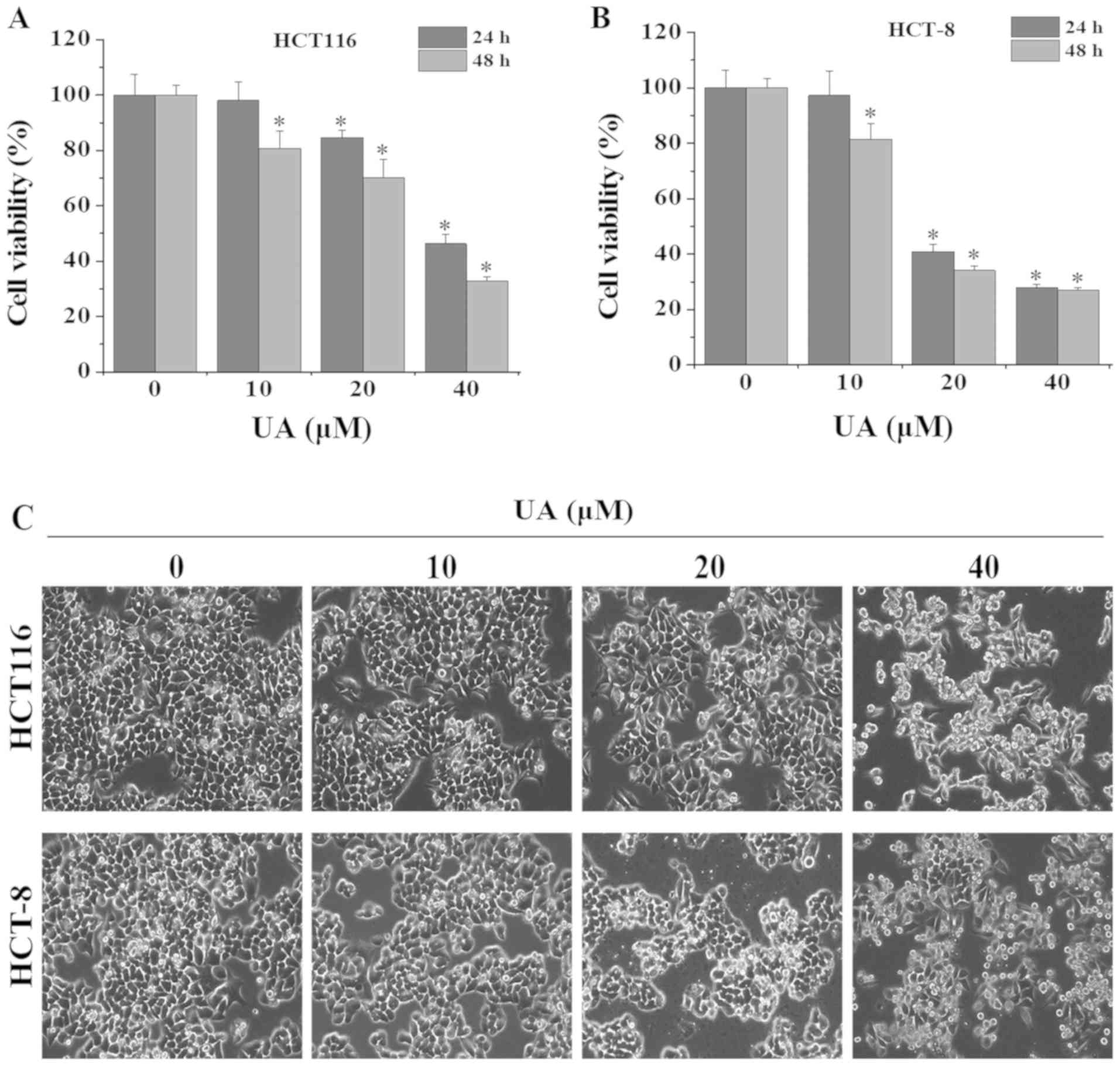 To evaluate the inhibitory effect of UA on the growth of HCT116 and HCT-8 cells, MTT assays were performed. UA treatment significantly inhibited cell viability in both a dose- and time-dependent manner (Fig. 1A and B). After 24 h of treatment, the half maximal inhibitory concentration (IC50) values of UA for HCT116 and HCT-8 cells were calculated to be 37.2 and 25.2 µM, respectively. Similarly, after 48 h of treatment, the IC50 values of UA were determined to be 28.0 and 19.4 µM for HCT116 and HCT-8 cells, respectively. Cells exhibiting condensed and fragmented nuclei are considered as growth inhibited. Phase-contrast microscopy was used to examine the effect of UA on HCT116 and HCT-8 cell morphology. Untreated control cells were observed in a confluent monolayer, healthy and attached to the culture plate, whereas UA treatment significantly decreased the confluence of these two cell lines and resulted in condensed, fragmented and detached cells, in a dose-dependent manner (Fig. 1C). Taken together, these results indicated that UA significantly inhibited the growth of HCT116 and HCT-8 cells.