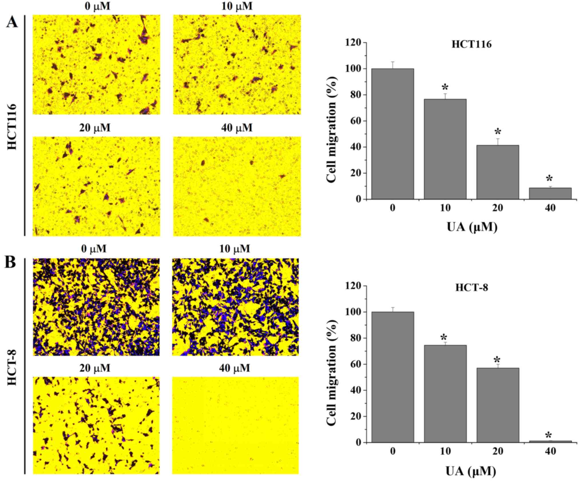 To evaluate the cell migration and invasion, Transwell assays were conducted using Transwell cell culture chambers with 8 µm pore filters (Corning Life Sciences). After treatment with 0, 10, 20, 40 µM of UA for 24 h, HCT116 and HCT-8 cells were harvested and resuspended in serum-free RPMI-1640 without UA. Then, ~5×104 cells that survived after the indicated concentrations of UA treatment for 24 h were seeded into the upper chambers. The lower chambers were filled with RPMI-1640 media containing 10% FBS as a chemoattractant. Cells were allowed to migrate towards the complete medium for 12 h in the migration assay, the non-migrating cells in the upper chamber were wiped and the migrated cells were stained with crystal violet for 15 min at room temperature. For quantification, the average number of migrated cells per field was assessed by counting three random fields under a phase contrast microscope (Leica Microsystems GmbH) at a magnification of ×200. The cell invasion assay was similar to the migration assay, except that the upper chambers were coated with Matrigel matrix (BD Biosciences).