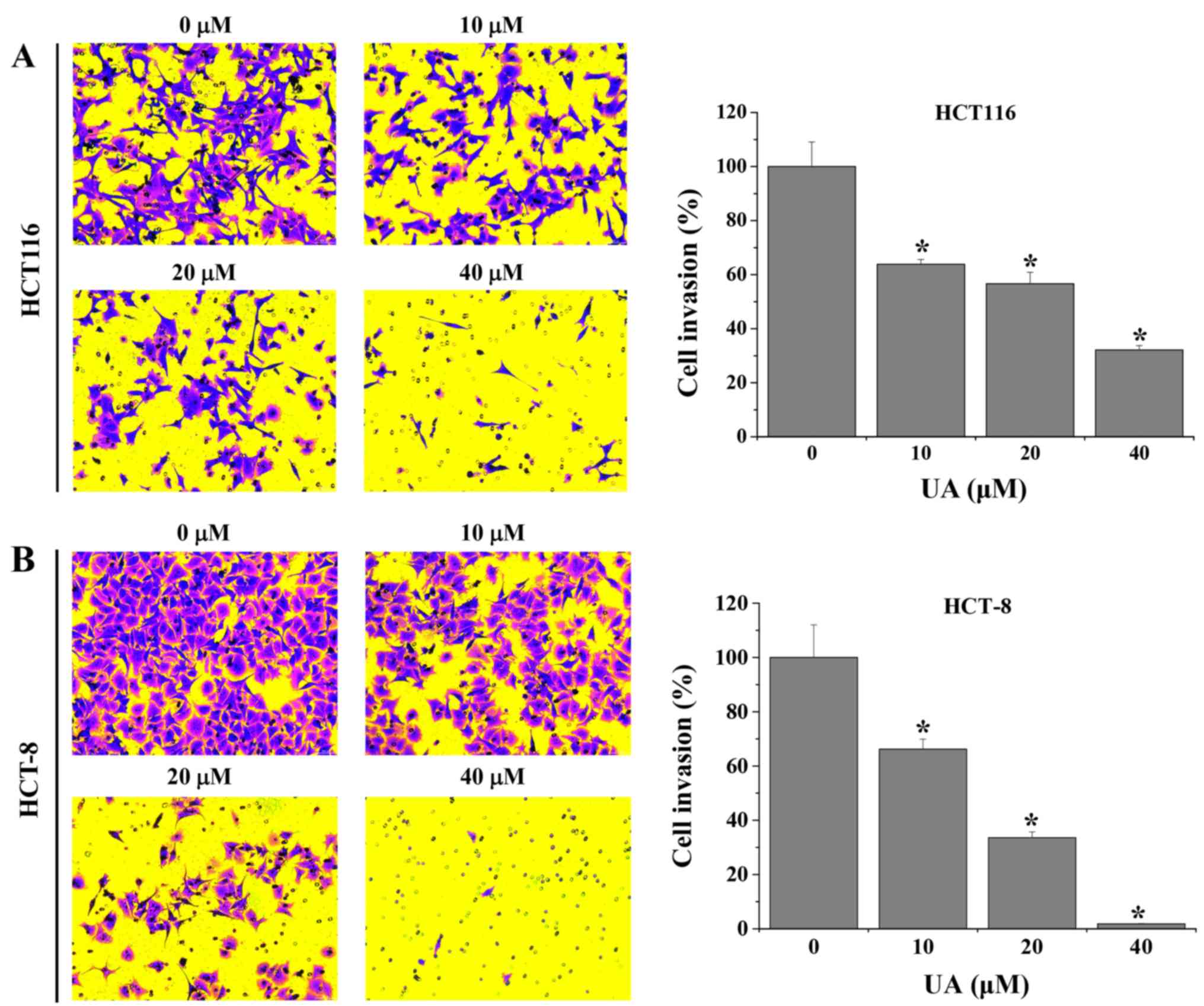 Transwell assays were performed to evaluate the effect of UA on the migration of HCT116 and HCT-8 cells. As shown in Fig. 2, the results demonstrated that treatment with 10–40 µM UA significantly decreased the migratory rate of HCT116 and HCT-8 cells by 23.3±4.2–91.3±1.2% and 25.5±2.4–98.8±0.2%, respectively, when compared with untreated cells. Furthermore, UA was demonstrated to inhibit the invasive abilities of HCT116 and HCT-8 cells. The results revealed that the invasion rate of HCT116 and HCT-8 cells following UA treatment was 36.2±1.8–67.9±1.6% and 33.8±3.7–98.2±0.2%, respectively, compared with that in the untreated cells (Fig. 3). Taken together, these results suggest that UA exhibited an inhibitory effect on the migration and invasion properties of HCT116 and HCT-8 cells in a dose-dependent manner.