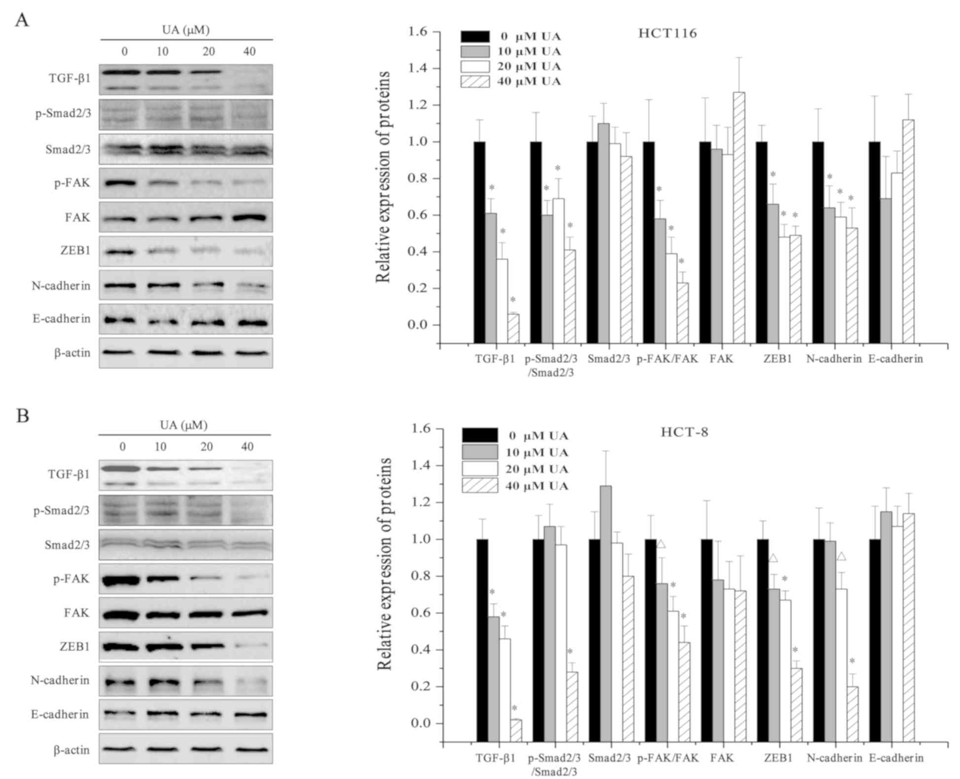 EMT has been shown to be associated with the metastasis of tumor cells (32). TGF-β1 signaling pathways, including the canonical TGF-β1/Smad pathway and the non-canonical TGF-β1/FAK signaling pathway, can trigger EMT (10,33). To better understand whether UA inhibited TGF-β1 signaling pathways, the expression of several pivotal mediators of TGF-β1/Smad and TGF-β1/FAK signaling pathways was assessed in HCT116 and HCT-8 cells. As shown in Fig. 4, western blot analysis revealed that UA treatment (0, 10, 20, and 40 µM) dose-dependently decreased the expression levels of TGF-β1, and the expression levels of the TGF-β1 target gene ZEB1. Activation of Smad2/3 and FAK is mediated by their phosphorylation, and UA treatment also significantly reduced the phosphorylation levels of both Smad2/3 and FAK (Fig. 4). Inhibition of the TGF-β1/Smad and TGF-β1/FAK signaling pathways by UA led to a decrease in the expression of the mesenchymal marker N-cadherin compared with that in the control cells (Fig. 4). However, no difference was observed between the control cells and UA-treated cells regarding the protein expression levels of the epithelial marker E-cadherin (Fig. 4). These results indicated that the antitumor properties of UA may be mediated by the inhibition of the TGF-β1 signaling pathways.
