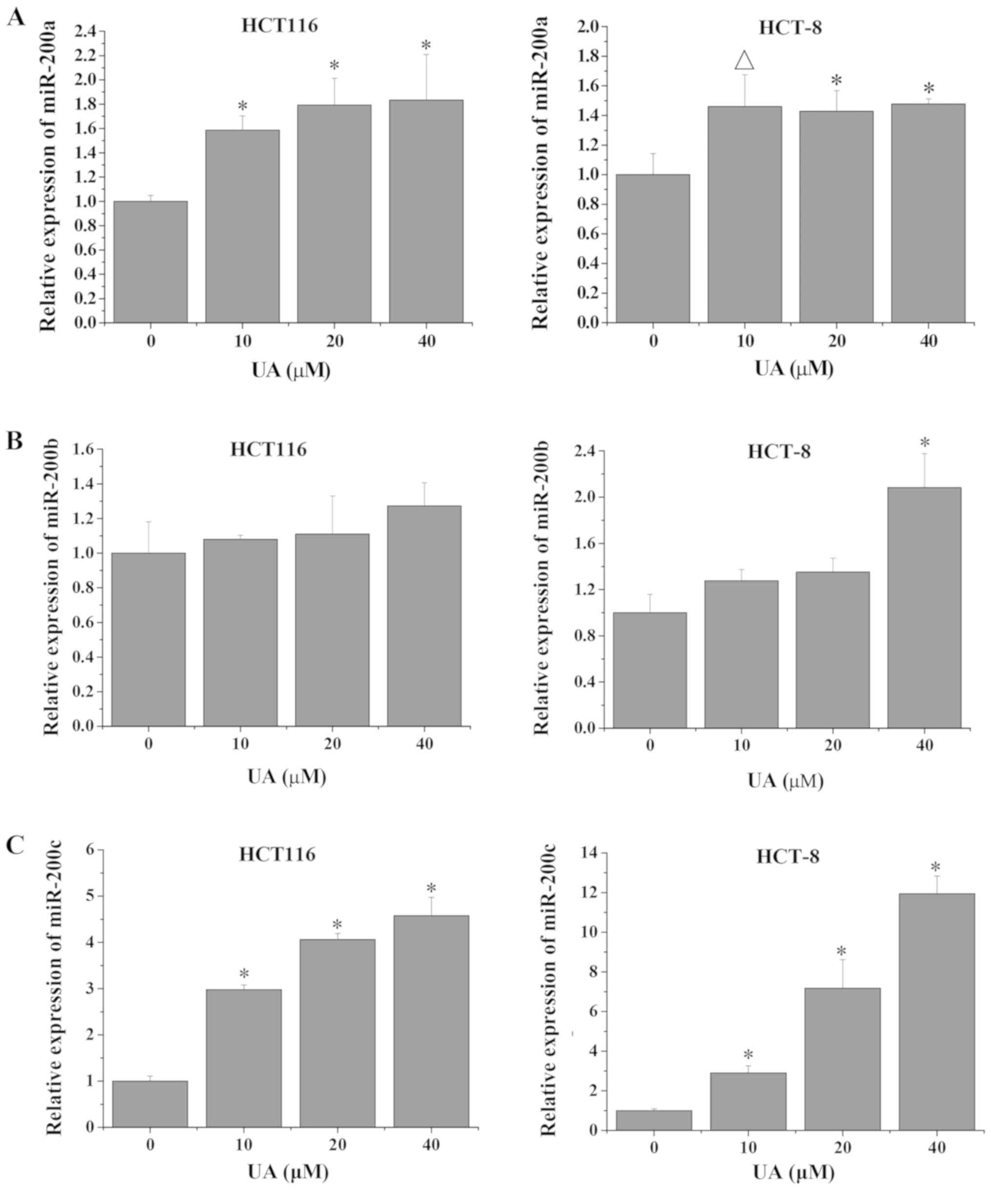 miR-200a/b/c maintains the epithelial phenotype and inhibits cell metastasis via downregulation of its target gene ZEB1 (34). In this process, TGF-β1 signaling increases the DNA methylation of miR-200a/b/c, thereby negatively regulating its expression (17). Thus, to further investigate whether UA inhibited colorectal cell invasion via regulation of the TGF-β1/ZEB1/miR-200a/b/c feedback loop, the expression levels of miR-200a/b/c were determined via RT-qPCR analysis. As shown in Fig. 5, the expression levels of miR-200a and miR-200c in HCT116 and HCT-8 cells were significantly increased following UA treatment compared with that in the untreated control cells. While the expression levels of miR-200b did not significantly change after UA treatment in HCT116 cells compared with the untreated control, HCT-8 cells exhibited a significant increase in miR-200b levels following treatment with 40 µM UA (Fig. 5). These findings are consistent with the observation that UA inhibited the TGF-β1 pathway and the expression of ZEB1 (Fig. 4). As shown in Fig. 5, the expression levels of miR-200c exhibited the highest increase following UA treatment. Therefore, the present results suggested that UA may inhibit cell growth and invasion in HCT116 and HCT-8 cells via regulation of the TGF-β1/ZEB1/miR-200c feedback loop.