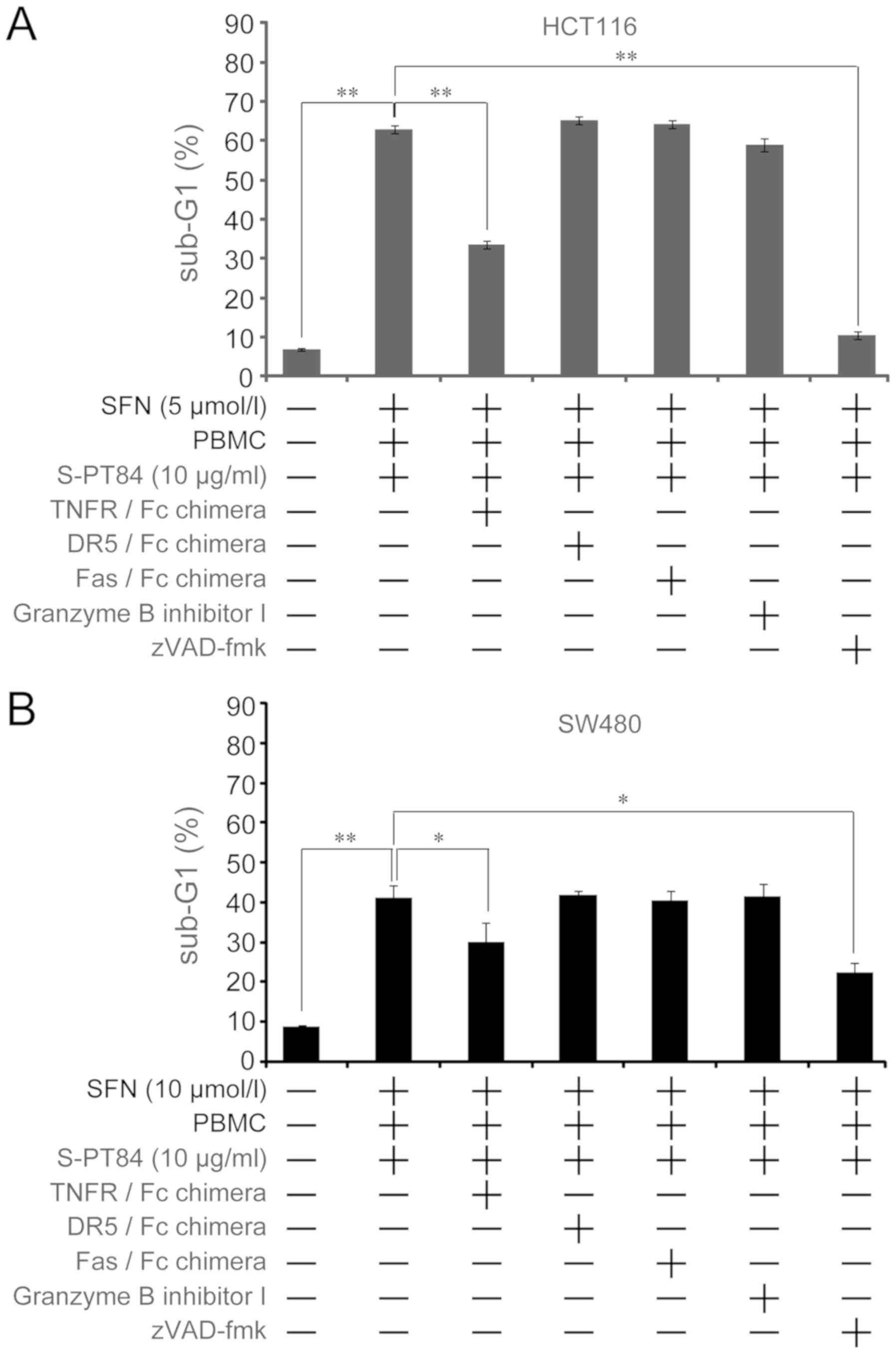 Previously, we showed that Lactobacillus strains facilitated natural killer activity against human cancer cells in vitro (25). Here, we evaluated the effect of L. pentosus S-PT84 on cellular immunity by inducing apoptosis in human colon cancer HCT116 and SW480 cells in co-culture with PBMCs treated by L. pentosus S-PT84. First, isolated PBMCs from a healthy volunteer were pre-treated by L. pentosus S-PT84 for 24 h. Second, PBMCs were co-cultured with human colon cancer cells. After 48 h, the sub-G1 population was examined by flow cytometry. Although non-treated PBMCs showed basal levels of cytotoxicity, Lactobacillus-treated PBMCs induced apoptosis against HCT116 and SW480 cells (Fig. 1). Similarly, the sub-G1 population was significantly increased by sulforaphane in both human colon cancer cell lines tested (Fig. 1B).