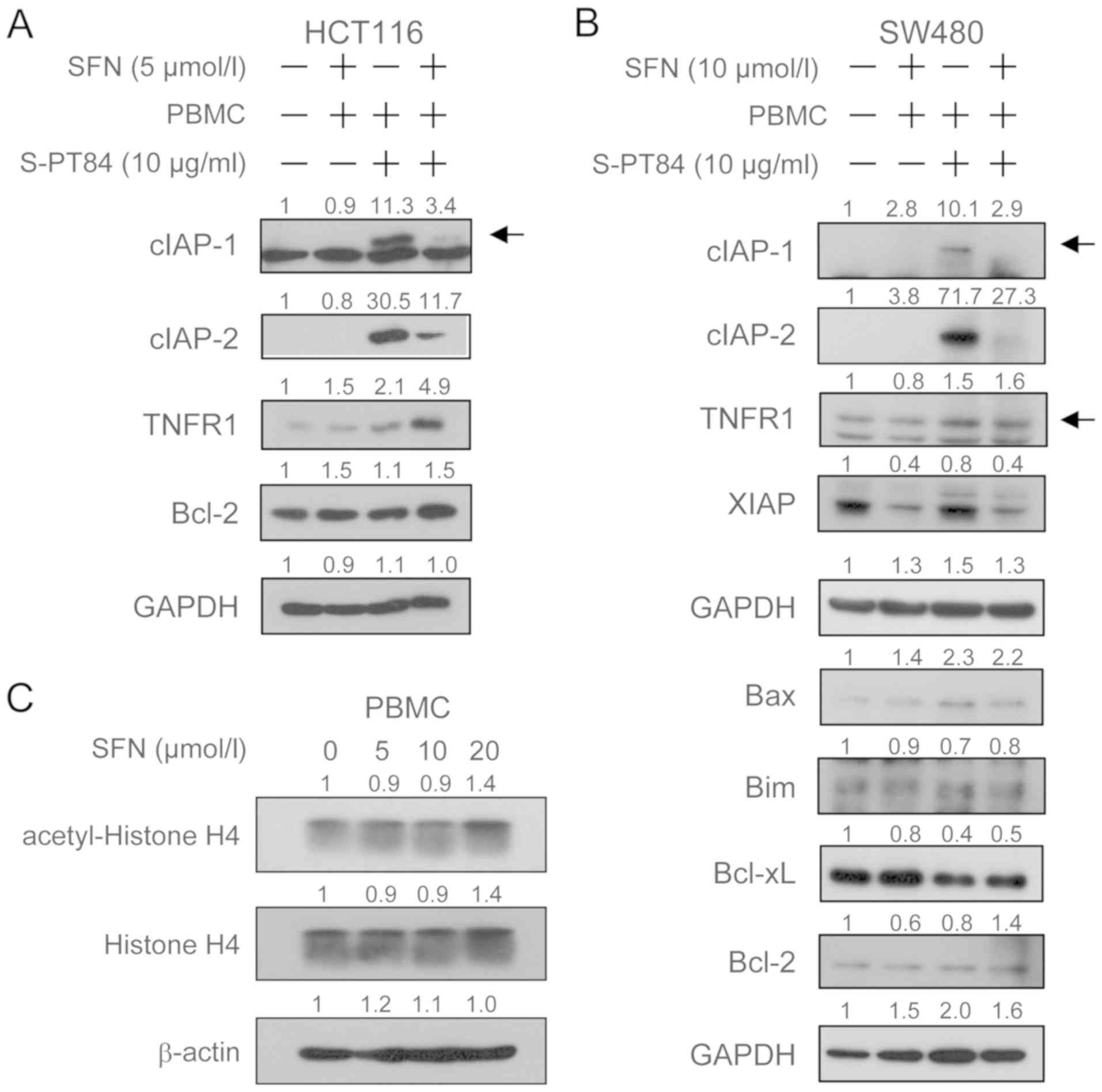 The expression of cIAP-1 and cIAP-2 was also markedly induced by co-culture with Lactobacillus-treated PBMCs in both cells. The induction of cIAP-1 and cIAP-2 may contribute to the prevention of apoptosis in colon cancer cells in co-culture with Lactobacillus-treated PBMCs despite upregulation of TNFα. Interestingly, sulforaphane suppressed the expression of cIAP-1 and cIAP-2 induced by co-culture with Lactobacillus-treated PBMCs. Sulforaphane downregulates cIAP-1 and cIAP-2 in human prostate cancer cells (14). Proteins in the IAP family are widely and highly expressed in many cancers and are an important target for anticancer therapy (51).