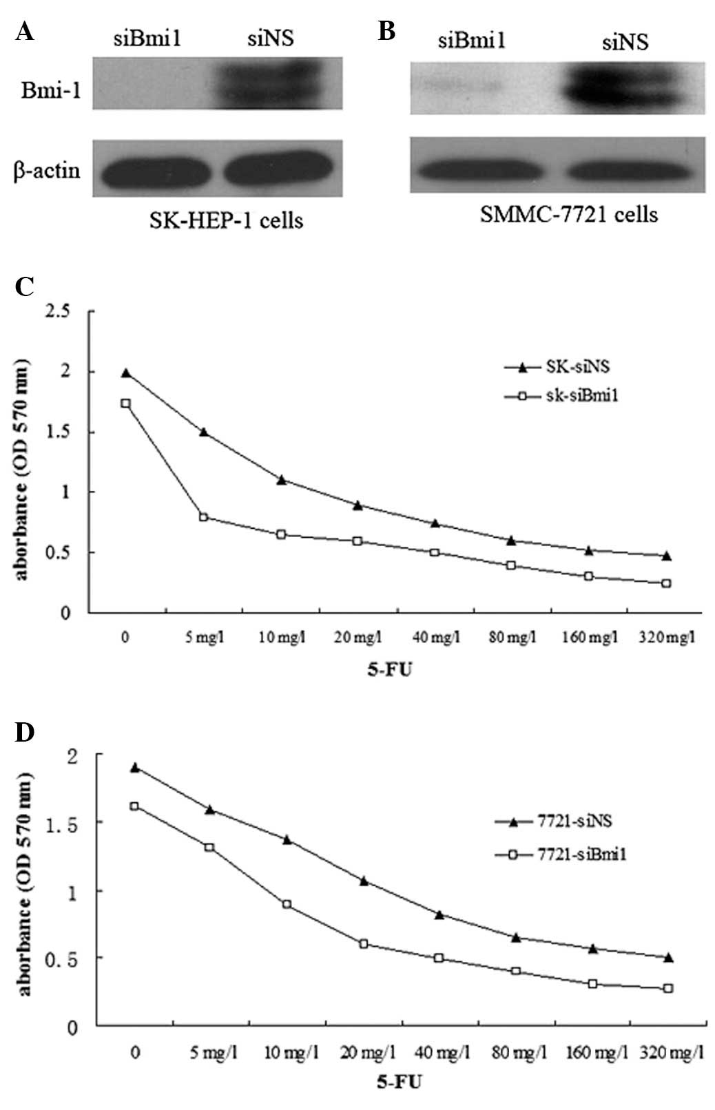 Once the SK-HEP-1-siBmi1 (SK-siBmi1), SK-HEP-1-siNS (SK-siNS), SMMC-7721-siBmi1 (7721-siBmi1) and SMMC-7721-siNS (7721-siNS) cells were treated with 5-FU (1–320 mg/l) for 72 h, an MTT assay was performed to examine the effect of 5-FU on the survival of Bmi-1 knockdown cells. The IC50 values of 5-FU in the SK-siBmi1 and SK-siNS cells were 9.97 and 20.85 mg/l, respectively; while the IC50 values of 5-FU in 7721-siBmi1 and 7721-siNS cells were 15.39 and 27.11 mg/l, respectively (Fig. 1C and D). The results indicated that Bmi-1 depletion increased the sensitivity of the cells to 5-FU.