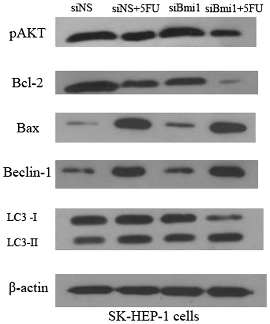 In conclusion, we report for the first time the anticancer potential of a combination of 5-FU treatment and Bmi-1 depletion in HCC cell lines. We identified that the knockdown of Bmi-1 increases the sensitivity of the SK-HEP-1 and SMMC-7721 cells to 5-FU treatment, and that depletion of Bmi-1 enhances 5-FU-induced apoptosis with a concomitantly induced autophagy in SK-HEP-1 cells. The PI3K/AKT and Bcl-2/Beclin-1 signaling pathway was involved in the sensitization of Bmi-1 to 5-FU treatment. Together, the combination of 5-FU and Bmi-1 depletion may be a potential therapeutic strategy in the treatment of human HCC.