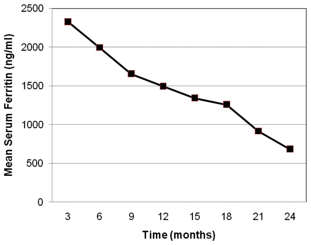At baseline, these 16 patients had a mean transfusion requirement of 3.3 units/month, which decreased to 2.0 units/month after 6 months of treatment and to 1.1 units/month after 24 months. These values were relatively unchanged in the remaining patients, who required a mean 2.8, 2.7 and 2.8 units/month at baseline, 6 and 12 months, respectively. One patient became transfusion-independent after 13 months of iron chelation therapy. The patient was transfusion-free (SF, 800 ng/ml) with a hemoglobin level of ~8.8 g/dl in December 2012, 30 months after starting iron chelation therapy.