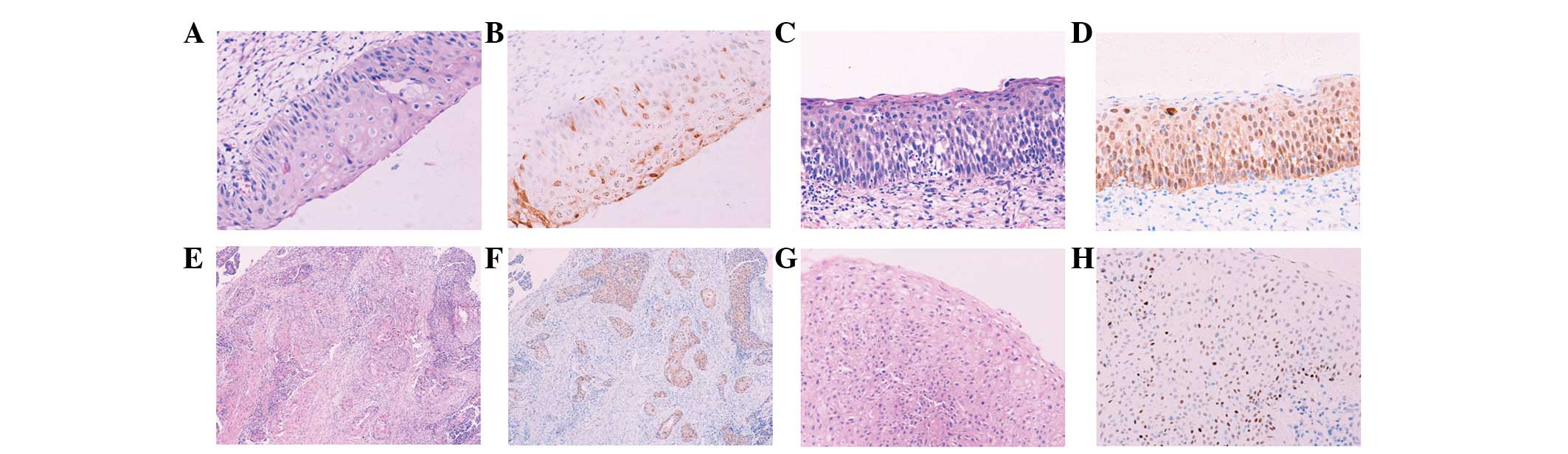 Cervical cancer is the second most frequent cause of cancer-related mortality in females worldwide and the most common type of cancer among females in the majority of developing countries (1–3). Currently, clinical management of preinvasive cervical cancer largely relies on histological examination to confirm cervical intraepithelial neoplasia (CIN) and its grading. Generally, higher grade (CIN II–III) cases require active treatment, including cervial conization or cervical loop electrosurgical excision procedure. Although the histological features of CIN are well understood, inconsistent use and misinterpretation of such features may occur due to intra- and interobserver variability (4,5). On the basis of morphology alone, it can be difficult to distinguish between squamous metaplasia coupled with hyperplasia (SMH) and CIN I, and between CIN I and CIN II–III. Moreover, small biopsy size, tangential sectioning, thermal artifact, coexistent inflammatory or reactive lesions and application of subjective criteria all increase the difficulty for the diagnosis of CIN (6). Therefore, objective diagnostic methods in addition to histology are required to accurately diagnose CIN in histological specimens.