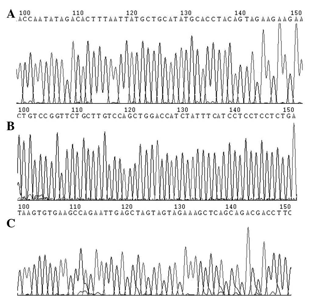 To ensure integrity of the DNA, a 5-μl DNA aliquot was amplified for the β-globin housekeeping gene by PCR with Taq polymerase (Sangon Biotech Shanghai Co., Ltd., Shanghai, China). Primers specific for the β-globin gene were as follows: PC04, 5′-CAA GAG CCA AGG ACA GGT AC-3′; and GH20, 5′-CAA CTT CAT CCA CGT TCA CC-3′. PCR was performed in a 50-μl reaction with 40 cycles of amplification. Each cycle included a denaturation step at 94ºC for 30 sec, primer annealing step at 53ºC for 30 sec and chain elongation step at 72ºC for 40 sec, followed by the final elongation step at 72ºC for 5 min. DNA products were visualized in 2.0% agarose gel.