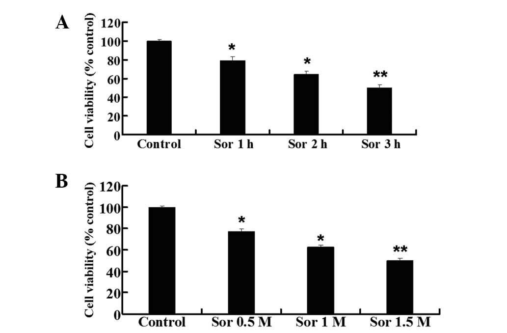 To investigate the growth inhibitory effects of sorbitol on colorectal cancer HCT116 cells, the cells were treated with 1.0 M of sorbitol for 1, 2 and 3 h or with various concentrations of sorbitol (0.5, 1.0 and 1.5 M) for 3 h. As demonstrated in Fig. 1A, treatment of HCT116 cells with 1.0 M concentrations of sorbitol for 1, 2 and 3 h markedly inhibited cell growth in a time-dependent manner. The growth inhibitory effect of sorbitol on cells gradually increased with the duration of time (P<0.05). As revealed in Fig. 1B, sorbitol (0.5–1.5 M) also exhibited significant growth inhibitory effects on HCT116 cells in a dose-dependent manner. Sorbitol with concentrations of 0.5–1.5 M demonstrated markedly higher growth inhibitory effects than the control group (P<0.05).