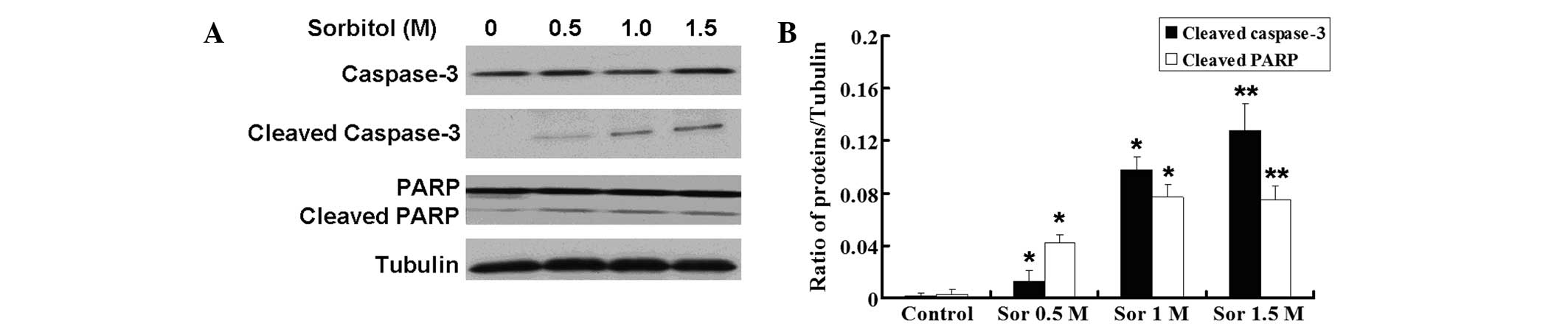 The HCT116 cells were incubated with different doses of sorbitol (0, 0.5, 1.0 and 1.5 M) for 3 h, respectively. Following protein extraction, western blotting was used to examine the expression of apoptosis-related proteins, capase-3, cleaved capase-3, PARP and cleaved PARP. The results demonstrated that the expression of cleaved capase-3 and cleaved PARP were markedly increased in the sorbitol treatment group as compared with that in the control group (Fig. 2A), and this difference was statistically significant (P<0.05; Fig. 2B).