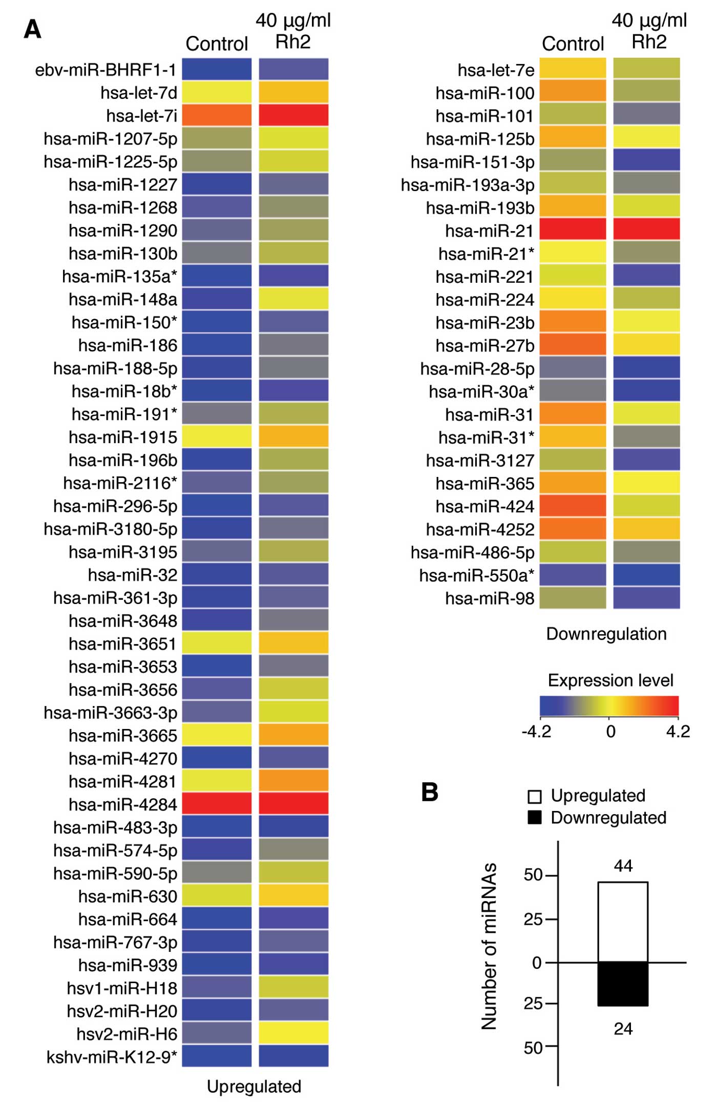 By using miRNA expression profiling, to the best of our knowledge, we report the first study demonstrating that the anticancer effect of Rh2 on NSCLC cells is mediated through changes in miRNA expression. We further report that the differentially expressed miRNAs are predicted to have several target genes with anticancer properties.