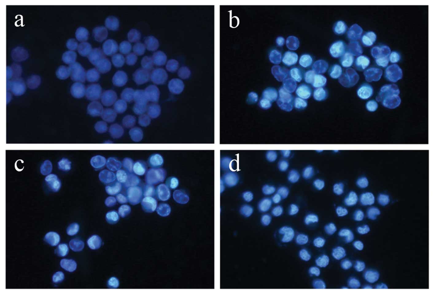 To evaluate the mode of cell death induced by terrein in HeLa cells, the experiment was carried out by staining cells with the DNA specific dye, Hoechst 33342. The cell samples were compared between the terrein-treated cells and the untreated control HeLa cells. The concentrations of terrein were 0, 0.3, 0.6 and 1.5 mM and were treated for 24 h. As depicted in Fig. 3, the untreated control cells displayed normal, round nuclei (Fig. 3a), while the cells treated with terrein exhibited characteristics of apoptosis, such as cell shrinkage, nuclear condensation and fragmentation in a dose-dependent manner (Fig. 3b–d).