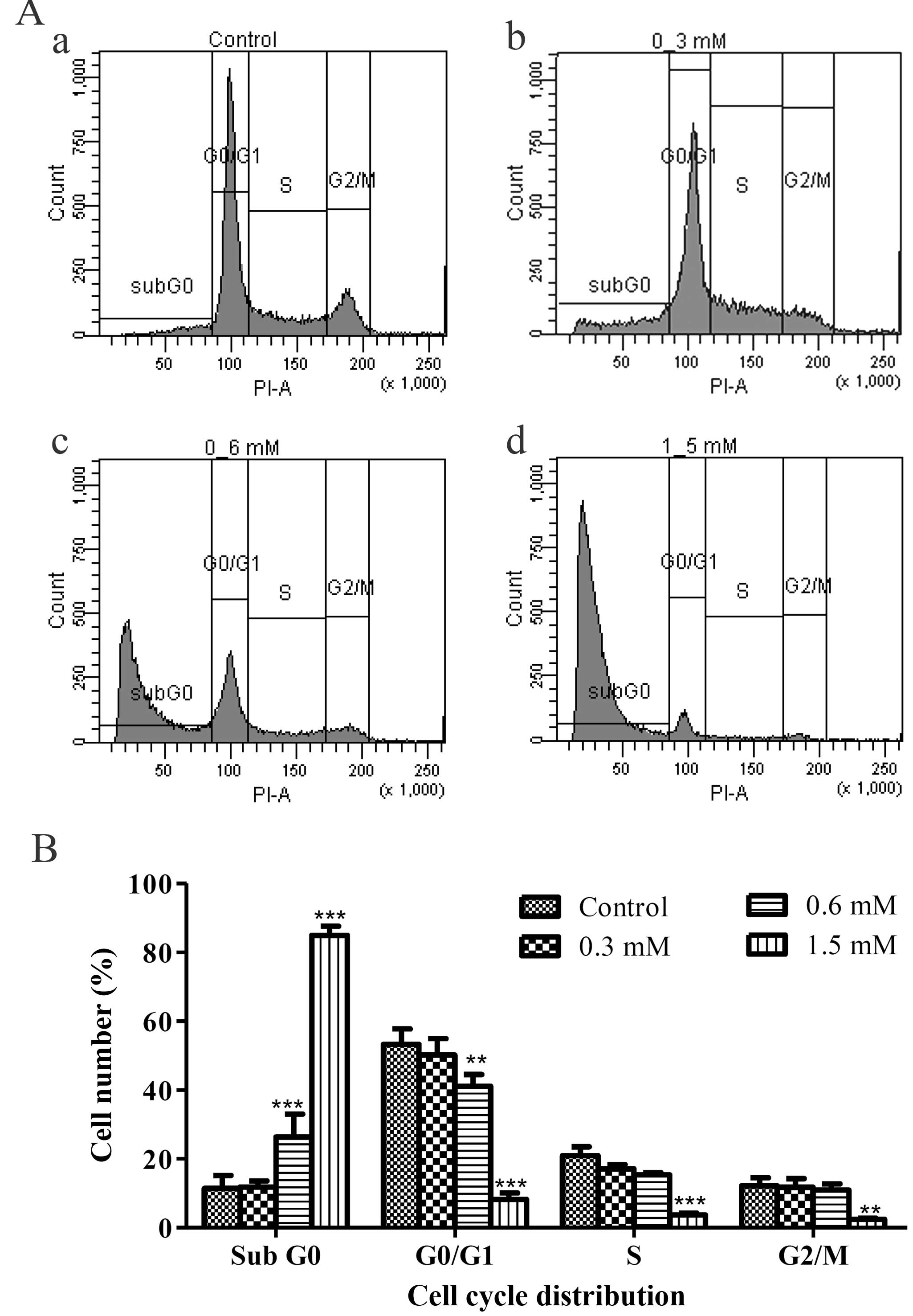 As the apoptotic cells with fragmented nuclei appear as cells with hypodiploid DNA content and could be detected at sub-G0 peak with flow cytometry, the numbers of the apoptotic sub-G0 population were quantified. The result demonstrated that the terrein-treated HeLa samples had significantly increased in the sub-G0 phase as compared to the untreated sample (Fig. 4Aa–d). The statistics of each phase of the cell cycle showed that the sub-G0 populations increased as the doses of terrein increased from 11.90 to 26.37 and 84.93%. (Fig. 4B). These results suggest that apoptosis is the mode of cell death used by terrein against HeLa cells.