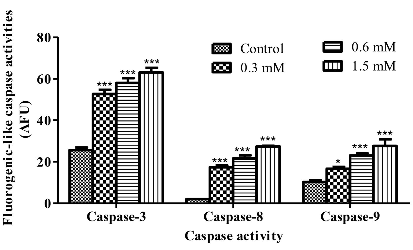 Caspase-3, -8 and -9 activities were measured using fluorescent assay kit detection (Calbiochem Merck KGaA), according to the manufacturer’s instructions. Briefly, HeLa cells at 1×106 cells/well were placed on a 6-well plate, treated with terrein at 0, 0.3, 0.6 and 1.5 mM for 12 h. After the treatment, supernatants from cell lysates were incubated with fluorogenic substrates using DEVD-AFC (caspase-3-like), IETD-AFC (caspase-8-like) and LEHD-AFC (caspase-9-like), at 37°C for 2 h prior to monitoring with a fluorescent microplate reader with excitation set at 400 nm, and emissions at 505 nm.
