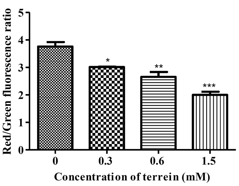 The changes in mitochondrial membrane potential (ΔΨm) were detected using a 5,5′,6,6′-tetrachloro-1,1′,3,3′-tetraethyl-benzimidazolyl-carbocyanine iodide (JC-1) dye (Biotium Inc.). In healthy cells, the JC-1 accumulates in the mitochondria as JC-1 aggregates (fluorescence is red) and also in the cytoplasm as JC-1 monomers (fluorescence is green). In early apoptosis, the ΔΨm collapses, making JC-1 aggregates unable to accumulate within the mitochondria and dissipate into the JC-1 monomers leading to a loss of the red fluorescence. Therefore, collapse of the ΔΨm is exhibited by a decrease in the ratio of red to green fluorescence (21). In accordance with the terrein treatment, HeLa cells at 1×104 cells/well were placed on a 96-well plate, treated with terrein at 0, 0.3, 0.6 and 1.5 mM for 6 h. Following treatment, the cells were harvested and incubated with a JC-1 reagent solution at 37°C for 20 min, then washed twice with PBS and suspended once more in the PBS. The samples were analyzed by a fluorescence microplate reader and measured with both the red fluorescence (excitation 550 nm, emission 600 nm) and the green fluorescence (excitation 485 nm, emission 535 nm). The ratio of red fluorescence intensity vs. green fluorescence intensity was calculated and presented as the means ± SD. This experiment was performed in triplicate.
