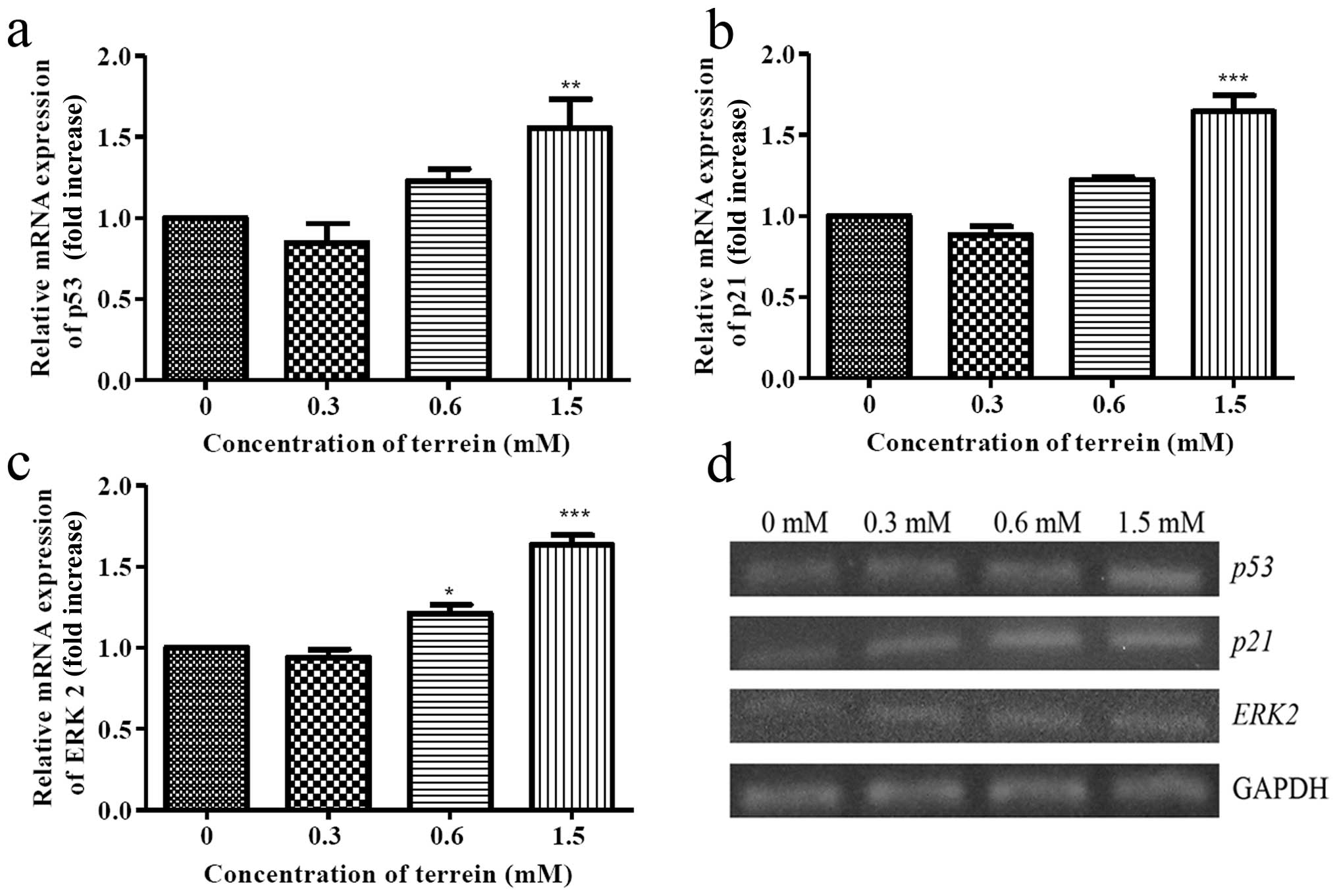 The tumor suppressor gene, p53, is known to be responsible for the inhibition of cell growth and/or the commitment to apoptosis. Meanwhile, p53 protein regulates the expression of the downstream effector p21, a potent inhibitor of cell cycle kinases, in which both are in response for DNA damage. In addition, p53 regulates apoptosis via upregulation of the expression of Bax and blocks the function of Bcl-2. Thus, it is possible that a substantial increase in the Bax/Bcl-2 ratio may have resulted from p53 function. The level of the expression of p53 and p21 were then examined. As shown in Fig. 8a and b, the expression of mRNA from both p53 and p21 was upregulated suggesting that the upstream signaling of the mitochondrial pathway was induced by terrein. To investigate this signaling triggered by terrein, further upstream mediators of p53 were evaluated. As is well known, several protein kinases may function to activate p53 and ERK2 may be the kinase that is responsible for the DNA damage. Therefore, we selected ERK2 to study the level of expression in response to the terrein treatment. As depicted in Fig. 8c, the mRNA expression of ERK2 increased following terrein treatment in a dose-dependent manner indicating the involvement of ERK signaling.