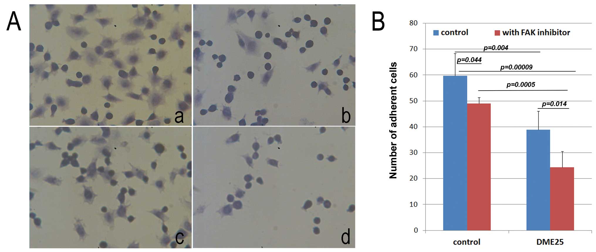 DME25 had a significant inhibitory effect on the adhesion of MG63 cells to a Matrigel-coated surface (Fig. 1A–a and B). The FAK inhibitor similarly inhibited the adhesion, although a weaker effect was noted when compared with that of DME25 at the concentration tested (100 nM) (Fig. 1A–c and B). The combination of DME25 and the FAK inhibitor markedly potentiated the inhibitory effect on cell adhesiveness (Fig. 1A–d and B).