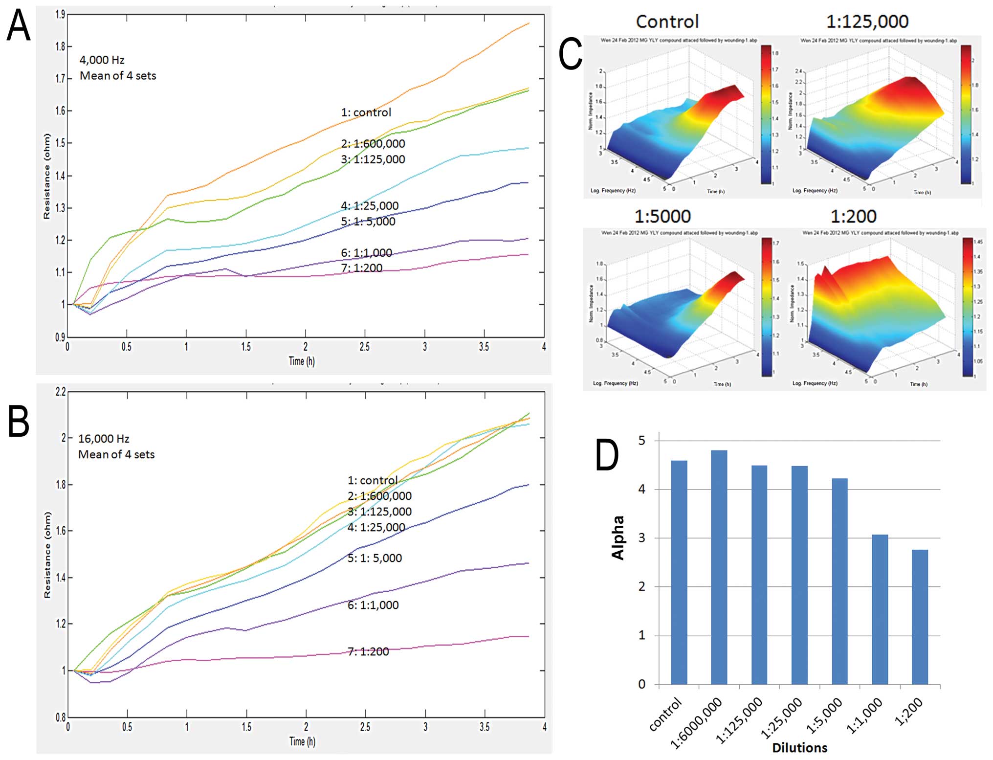 Using an automated ECIS method, we first demonstrated that DME25 had a marked effect on the adhesion of MG63 cells (Fig. 2). As shown in Fig. 2A, DME25 at a concentration as low as 1:125,000 dilution already demonstrated an inhibitory effect on cell adhesion, although a more profound inhibitory effect was noted after treatment at a concentration higher than 1:25,000. A similar trend was noted at both low and high frequencies in the experimental settings (Fig. 2A and B). This inhibitory effect was noted across all of the frequencies tested as demonstrated in the 3D graph (Fig. 2C).